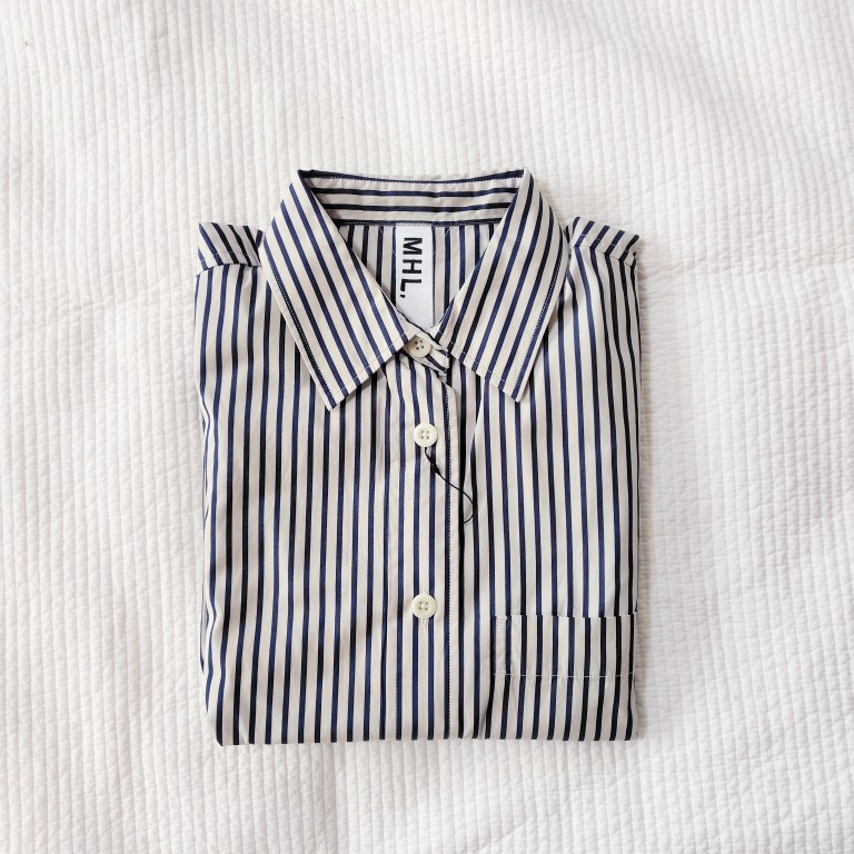 一見普通の白地にネイビーのストライプのシャツ。そうなんですが…、白地の色目がちょっとくすんでいていい感じで♡ハッキリしたストライプのシャツって持ってなかったので、素敵なお洋服に出会えて嬉しかったんですよね♪