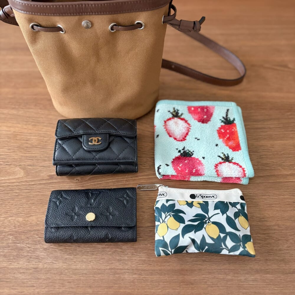 収納力は、この荷物の量で限界ですね。お財布もミニタイプなので収まりましたが、長財布だと厳しそう。。。これ以上の手荷物がある方は、ひとつ大きいサイズの「SAC COQUILLE BUCKET」が良さそうです。