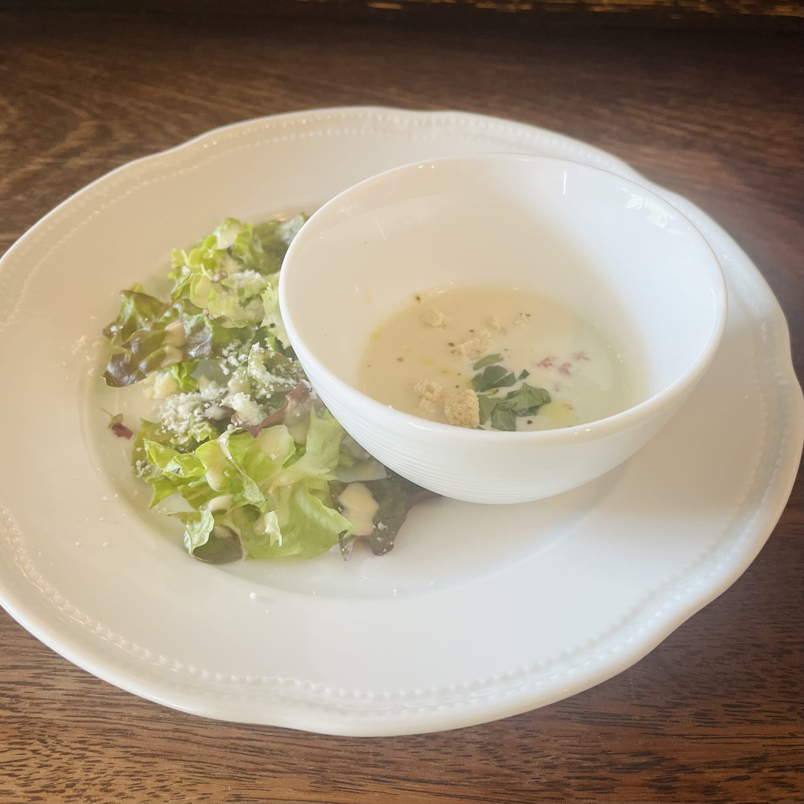 パスタとスープとサラダにパンもついたセット。