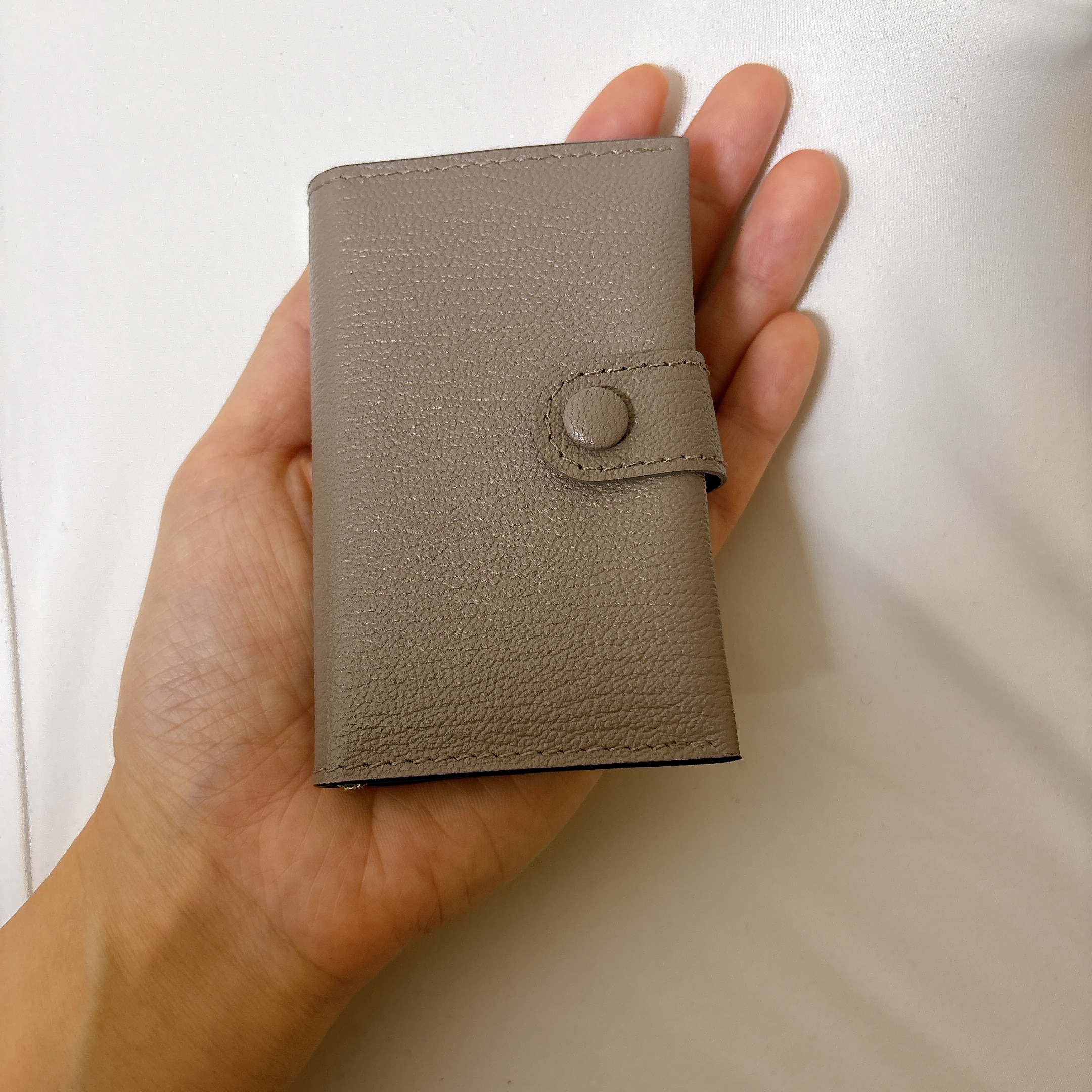 カード入れの裏側などの見えない部分までオールレザーにこだわり、ブランド名の型押しも美しくて、その繊細で精巧な作りをうっとりと細部まで眺めたくなります。