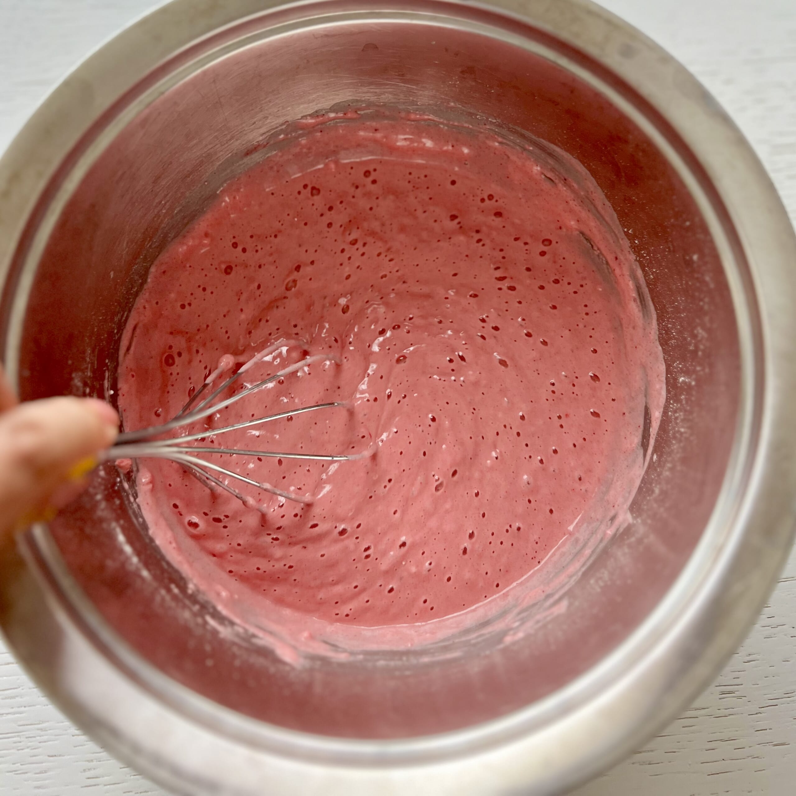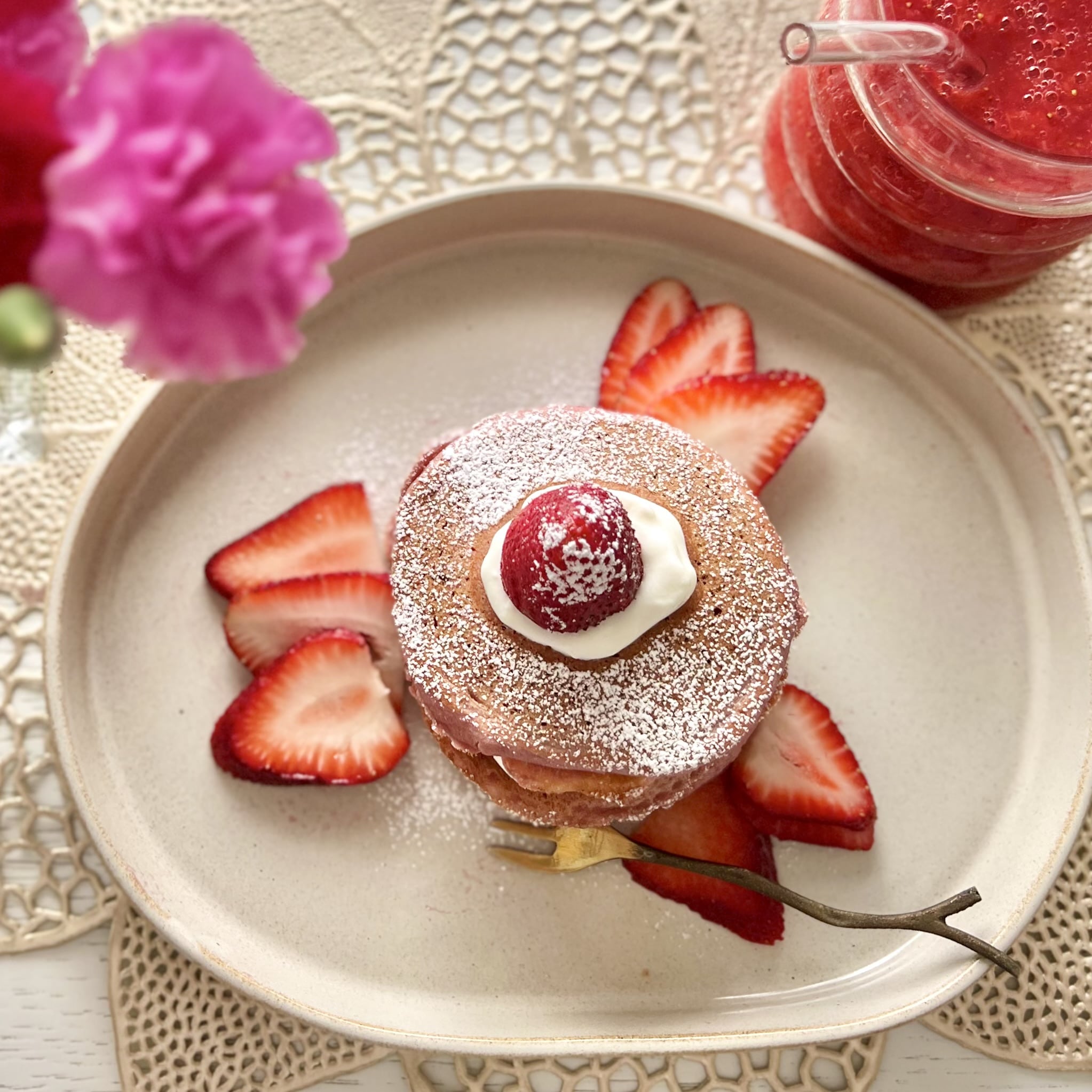 イチゴを添えて、仕上げにレモンをたっぷり絞ったフレッシュなイチゴジュースを添えたら、みんなが笑顔になるおやつの完成です。