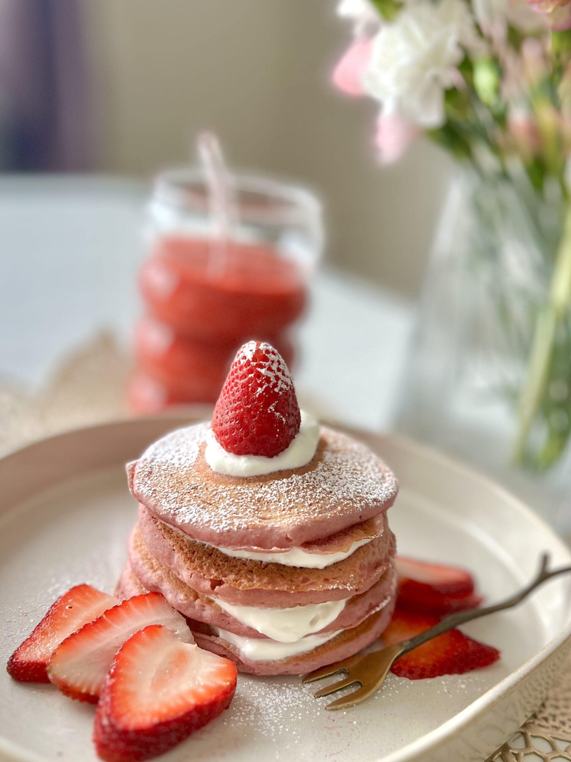 小さめに焼いたパンケーキに、濃厚なグリークヨーグルトをトッピング。