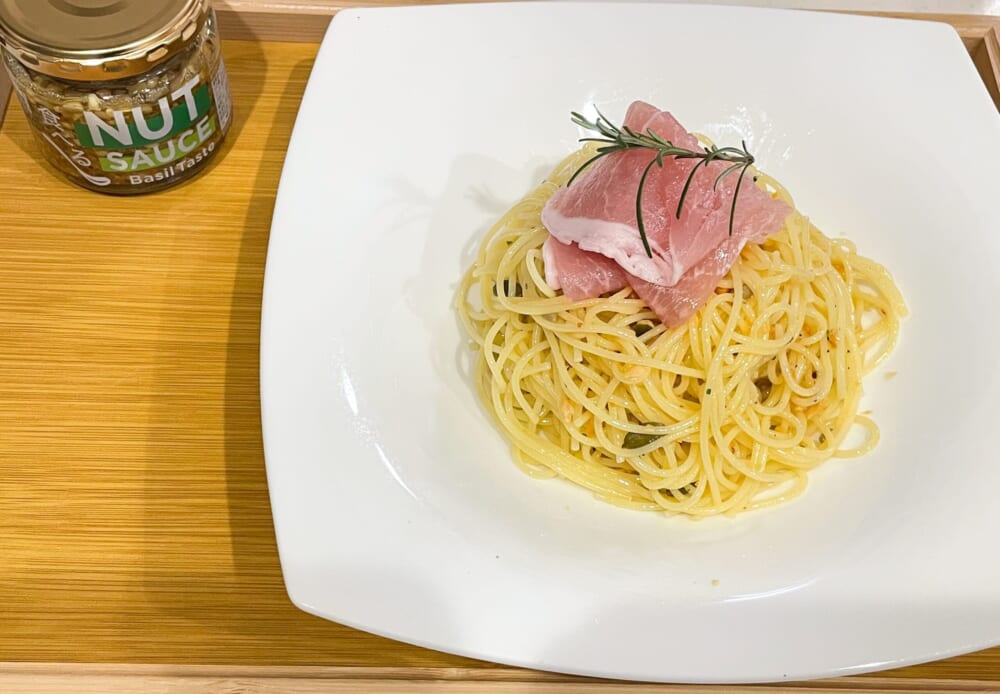 こちらのナッツソースに生ハム、お庭のローズマリーで簡単にパスタを作ってみました。