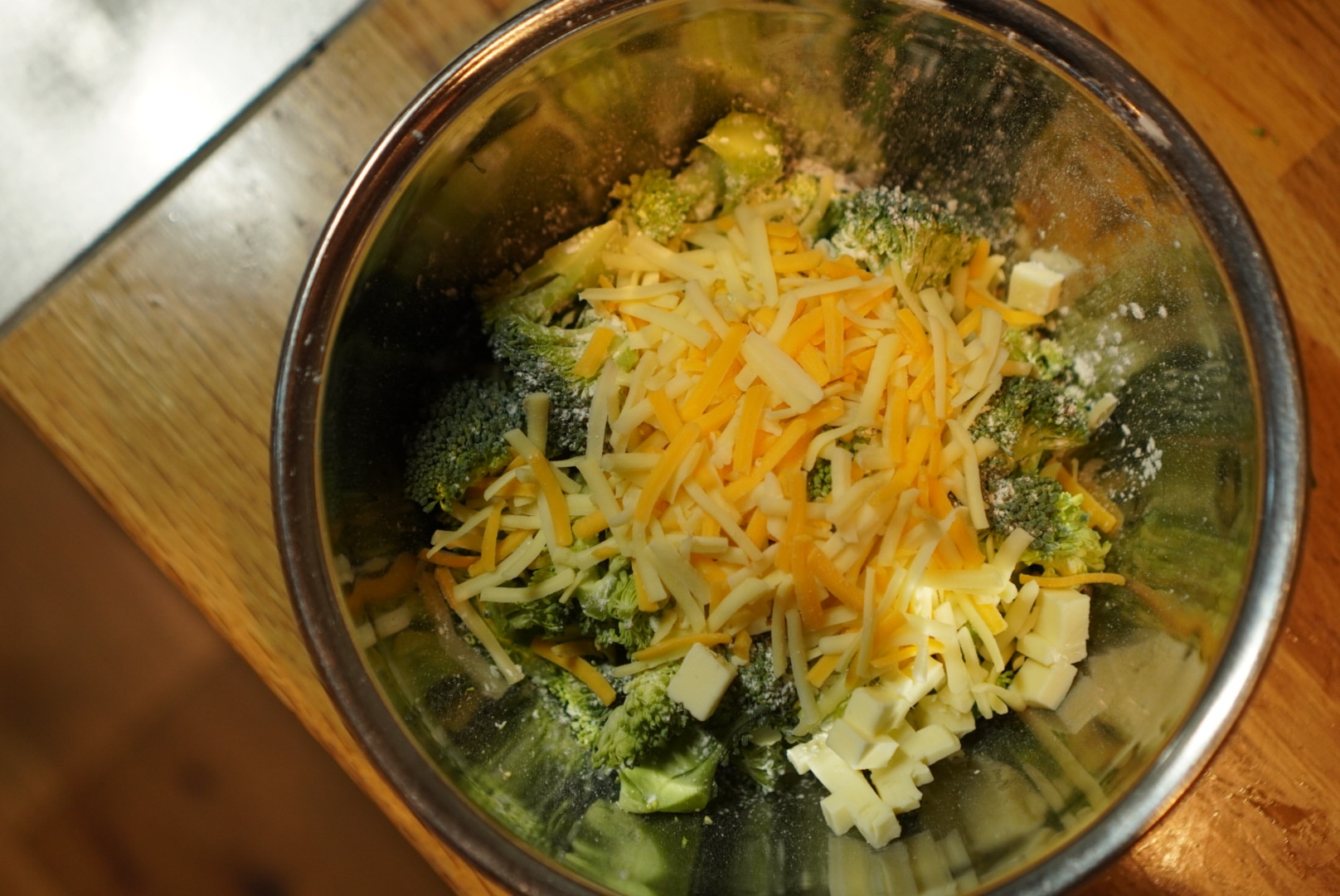 チーズと片栗粉を加えて混ぜます。(レシピに記載はありませんでしたが、チーズに塩気がなかったので、塩も少し加えました。)