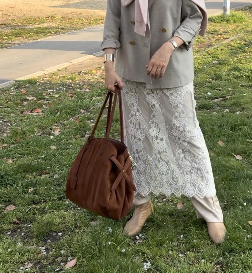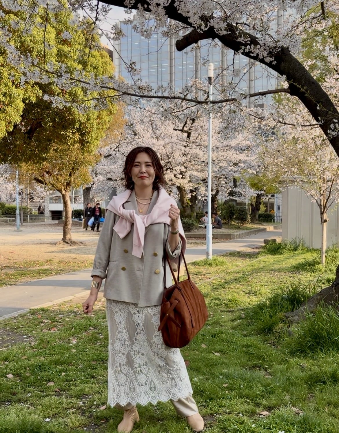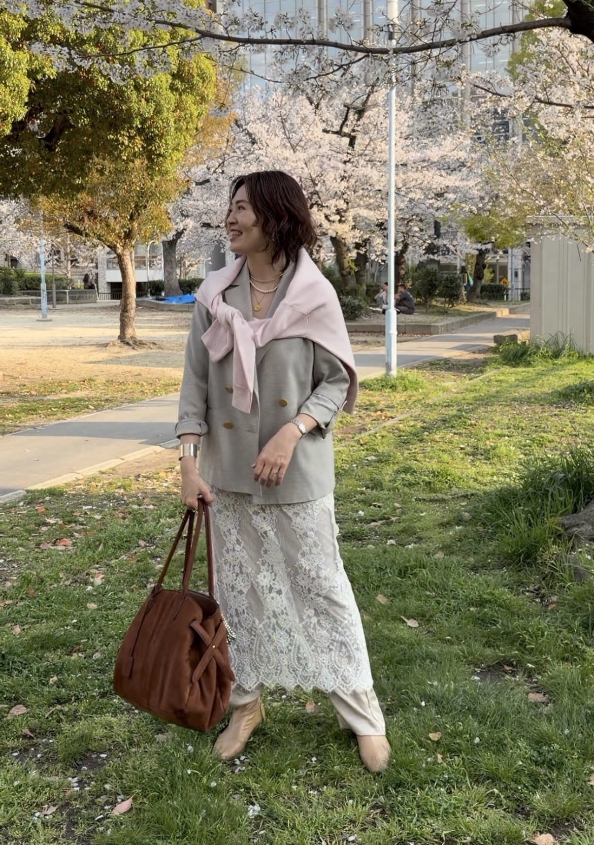 夜の食事会のドレスコードが「ピンク」だったのでジャケット×レーススカートに桜色のニットを肩掛けしてコーディネート。