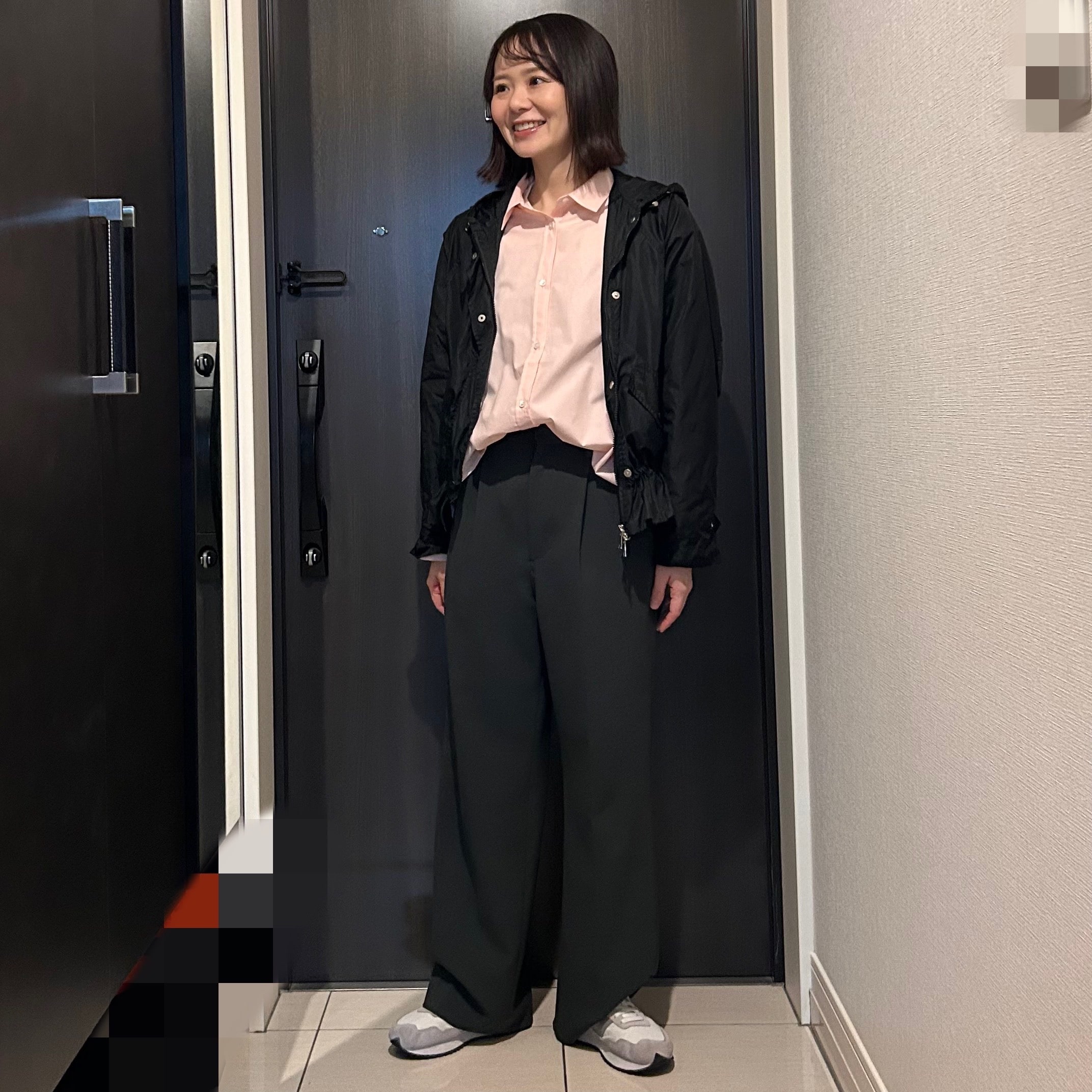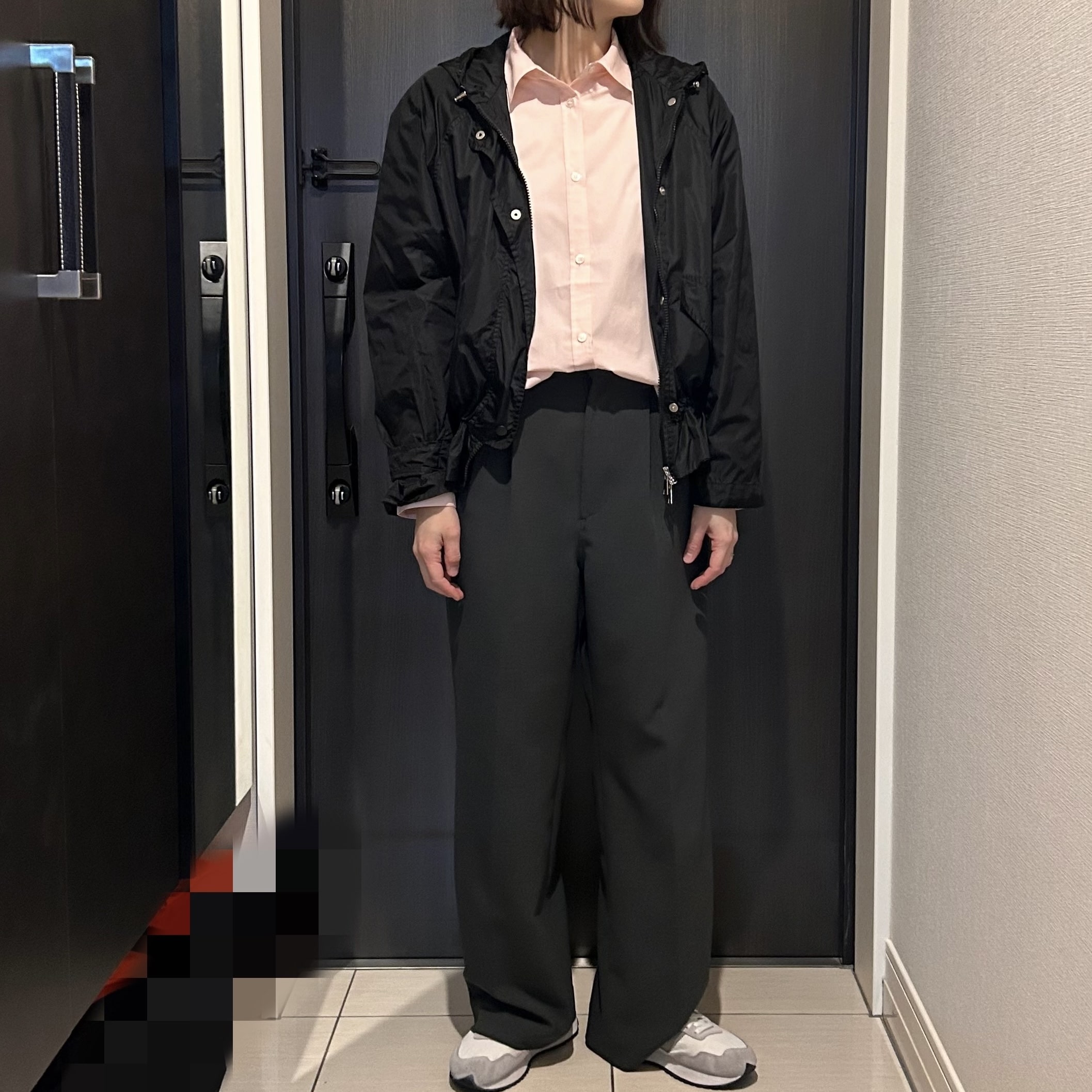 アウター:new meで購入、シャツ:urban research doors、パンツ:spick and span、スニーカー:New Balance