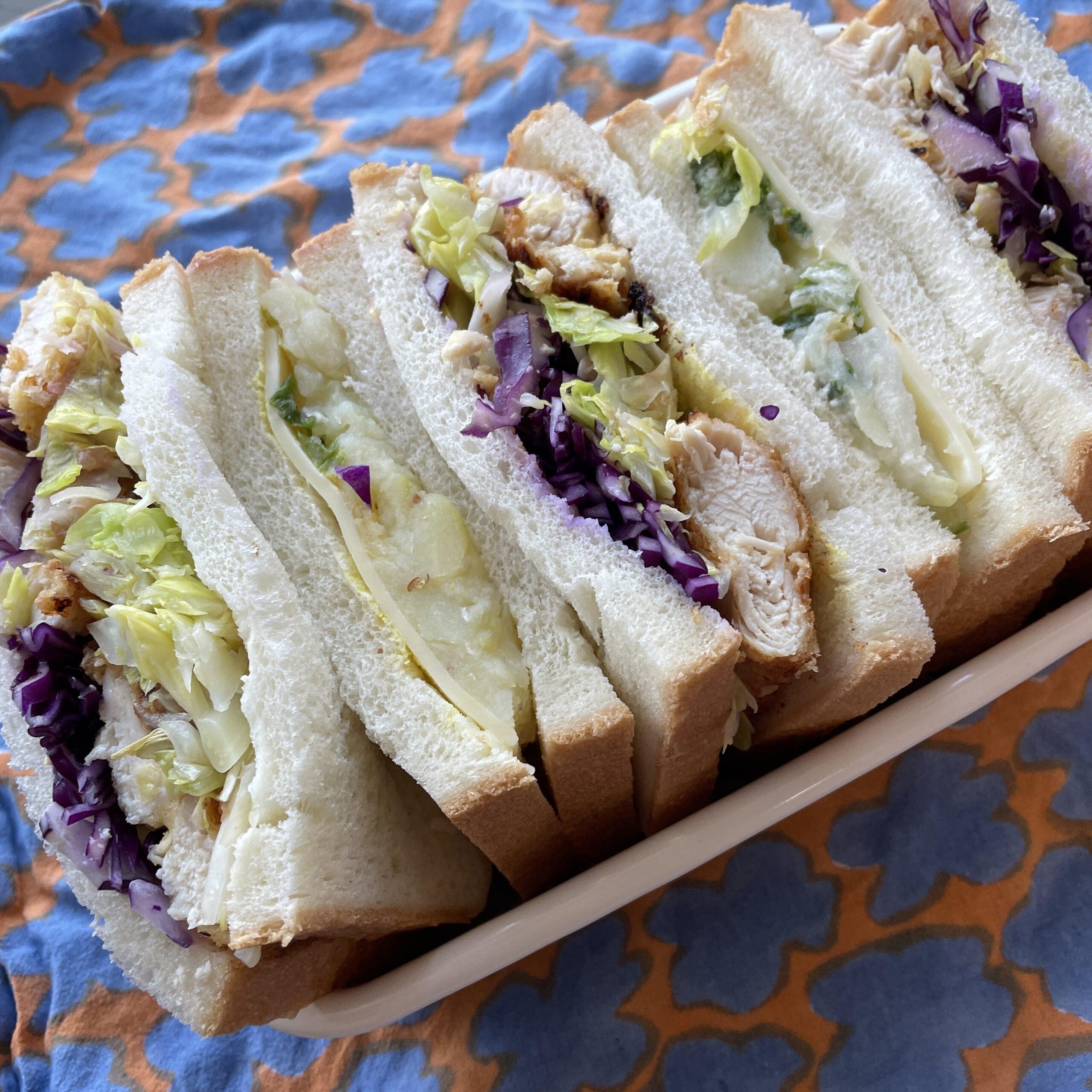 これは、「私が作ってみたい」と思ったサンドイッチ。朝食として、朝の忙しい時間でも作れました!ポテサラはマヨネーズではなく、市販の白菜漬けを混ぜます。ささ身カツは味噌を塗って、和風に。