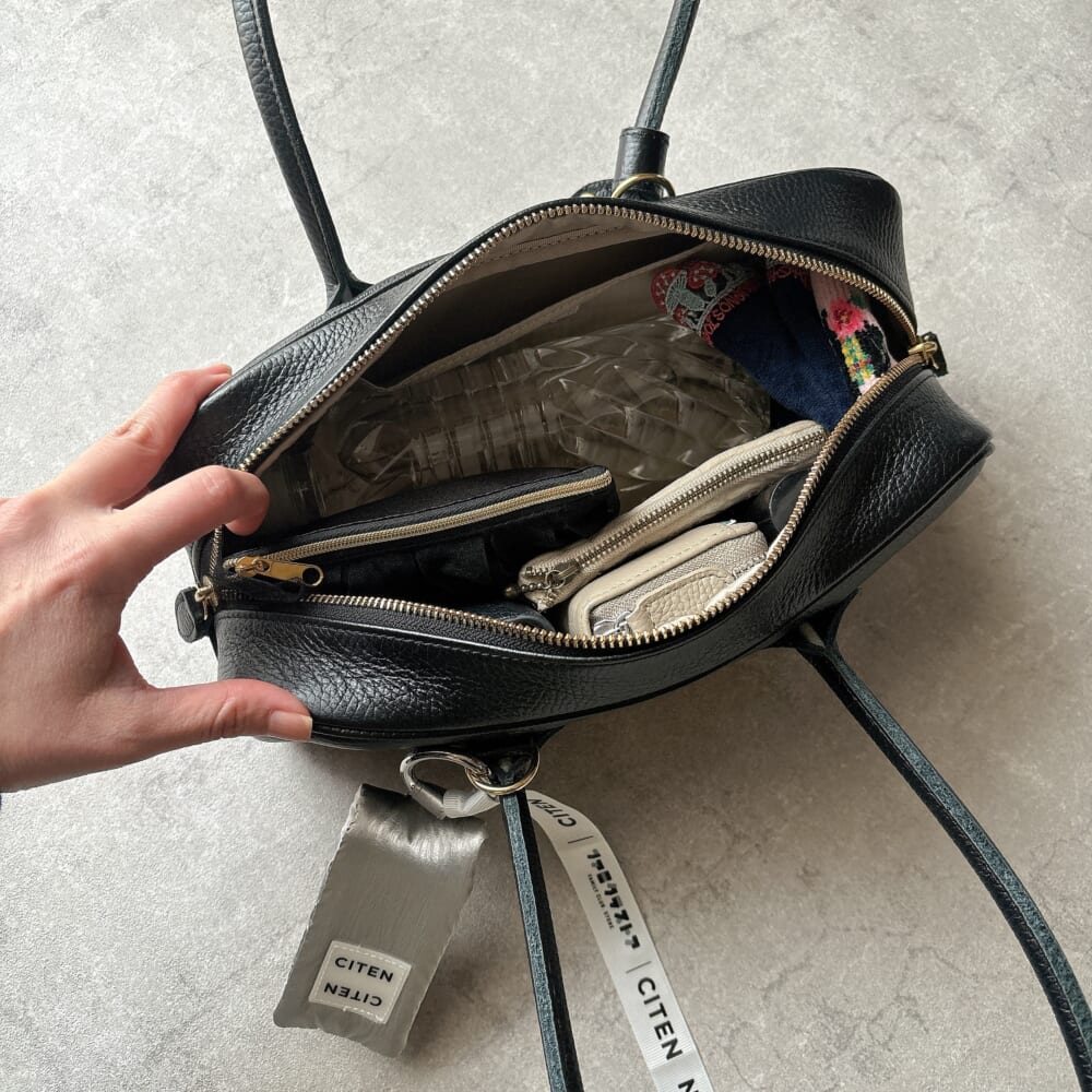 荷物が入るだけじゃなく、横長デザインだから縦が浅いのね。浅いバッグってさ、荷物めっちゃ探しやすいから~~~~~。