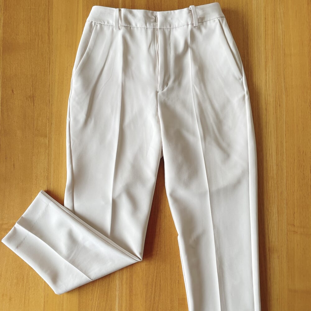 ワイドパンツとのセットアップも選べましたが、定番のテーパードパンツの方が全体的なバランスが良さそうに感じたのでこちらを選びました。