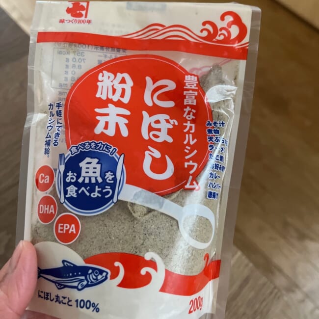 こちらの「にぼし粉末」です。味噌汁やうどん、先日は天ぷらの衣にも加えてみました。