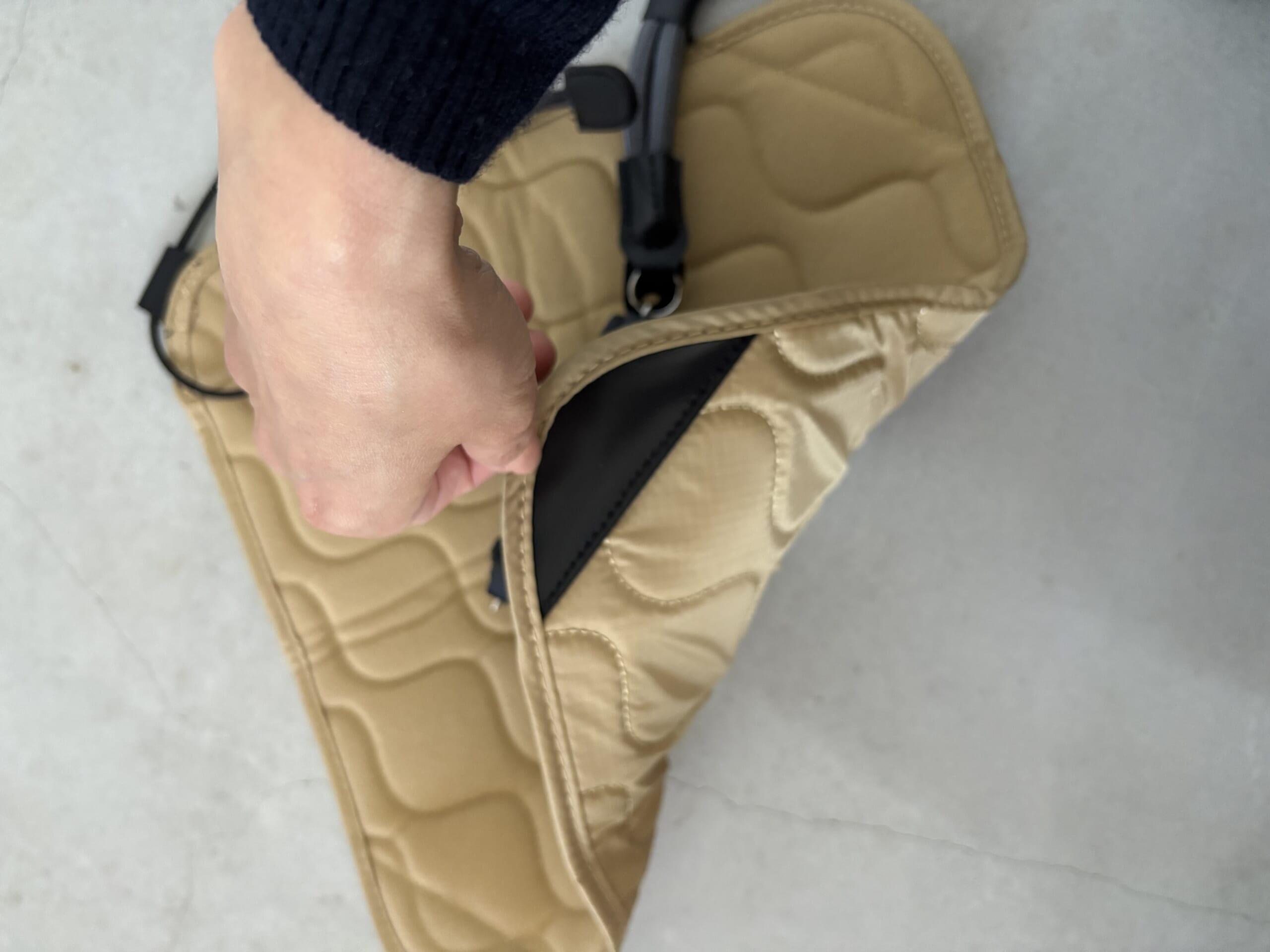 黒い部分がマジックテープのような素材で、裏地にピタッと付きます。ササっと畳めて簡単。