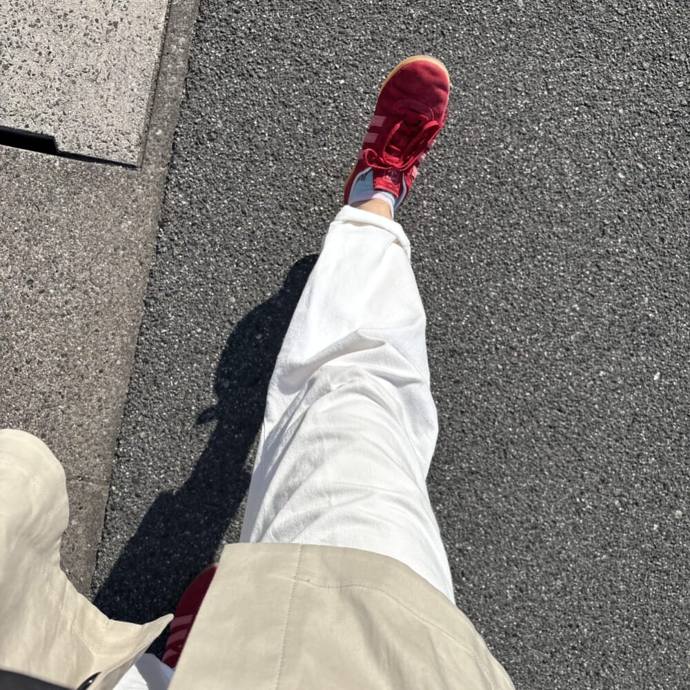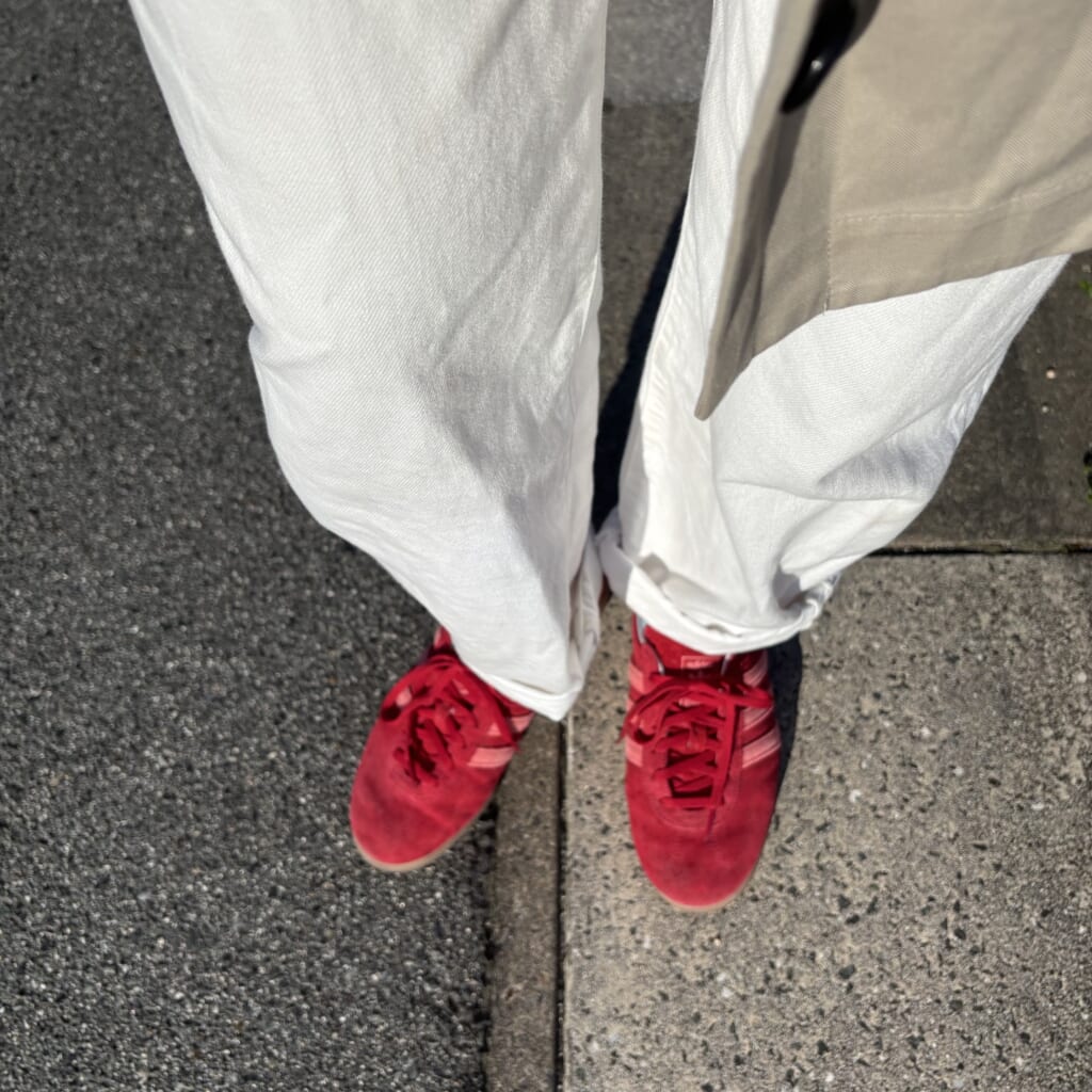 もともとはベーシックなSAMBAシリーズを求めてお店に入ったのですが、店員さんが身に着けている赤のスニーカーに惹かれ、自分も挑戦してみることに。