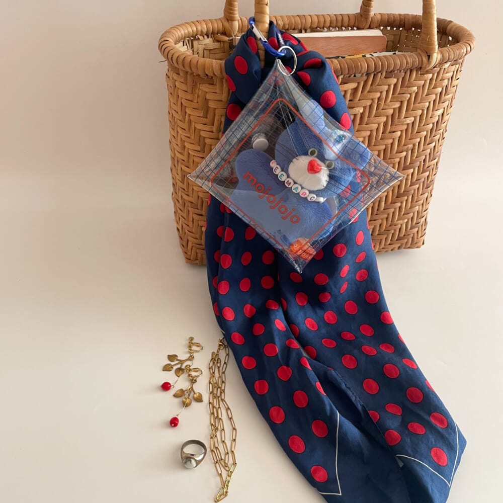 お手本のコーデが自然素材のバックに華やかスカーフを付けていたので、私も籠バックに華やかスカーフ&大活躍中LEEマルシェ×mojojojoさんコラボチャームを付けてみました。