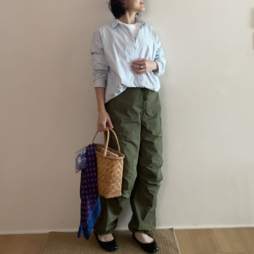 THE SHINZONEのカーゴパンツにUNIQLOの定番ロンTと神戸レタスのブルーストライプシャツでピリっと辛×辛に引き締め!