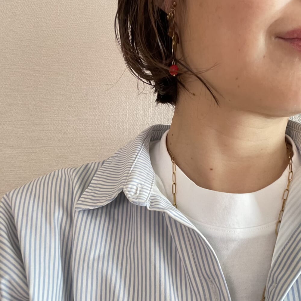 イヤリングは数年前に自作したもの。お手本コーデの竹下玲奈さんも赤い素敵なネックレスをされてますね…!!!