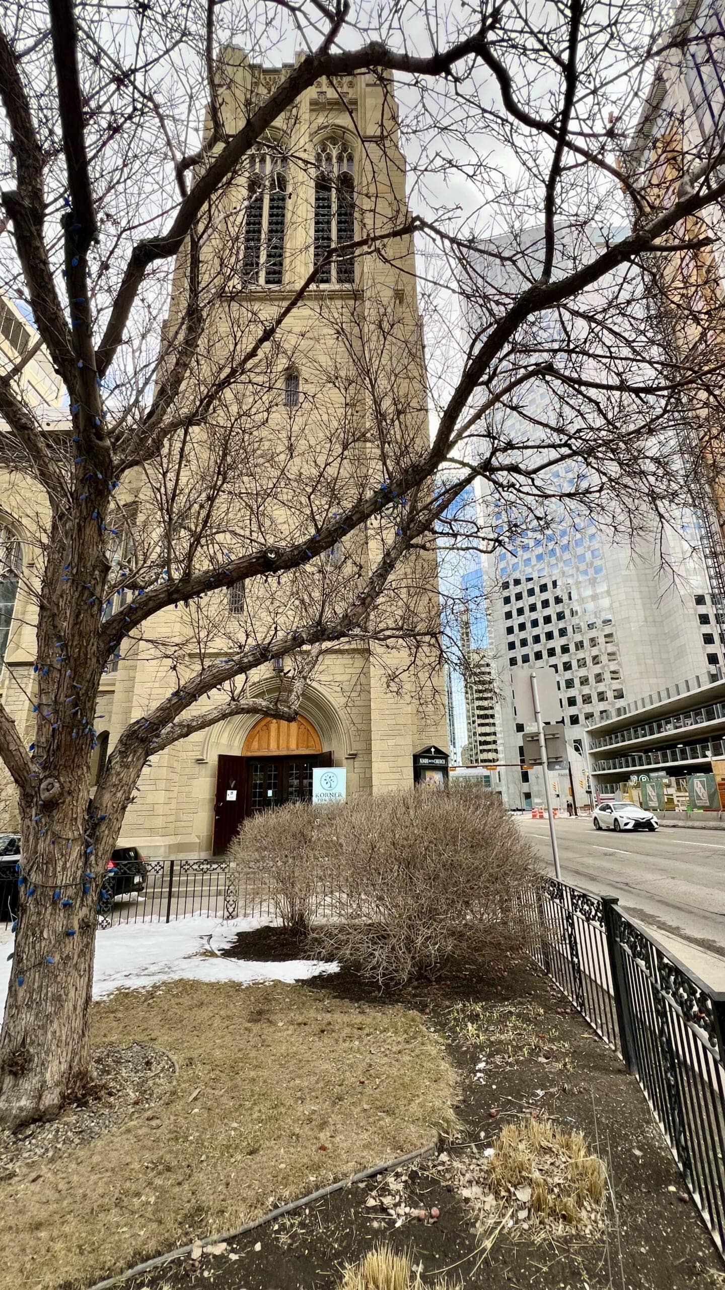 ダウンタウンの近代的な高層ビルの中に、ブリックでできたアンティークな佇まいの教会。