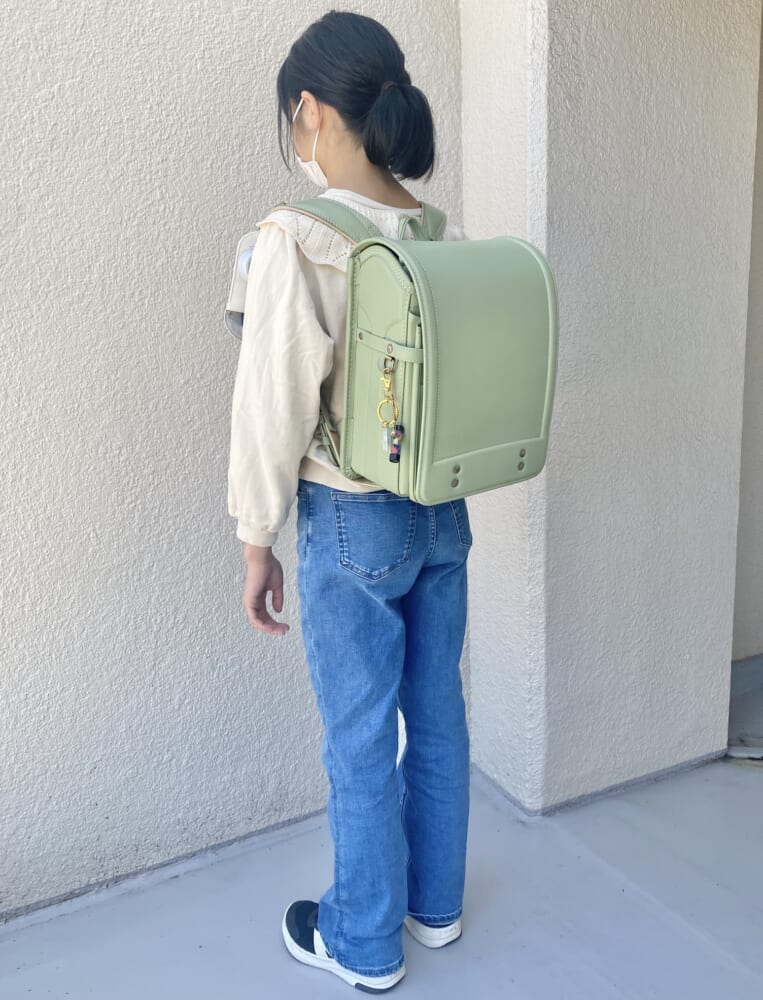 さて、購入時は珍しい色味なので飽きたりしないかなとか、淡い色だから低学年のうちはいいけど高学年でも似合うかなとか少し心配したものですが、6年生になった今でも大好きな色で、背負った姿も違和感なく使用できています。