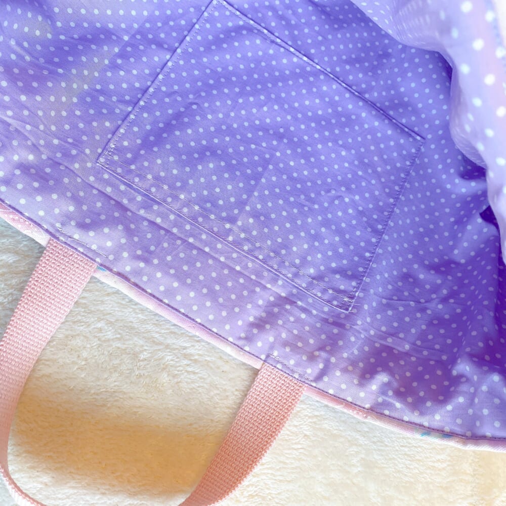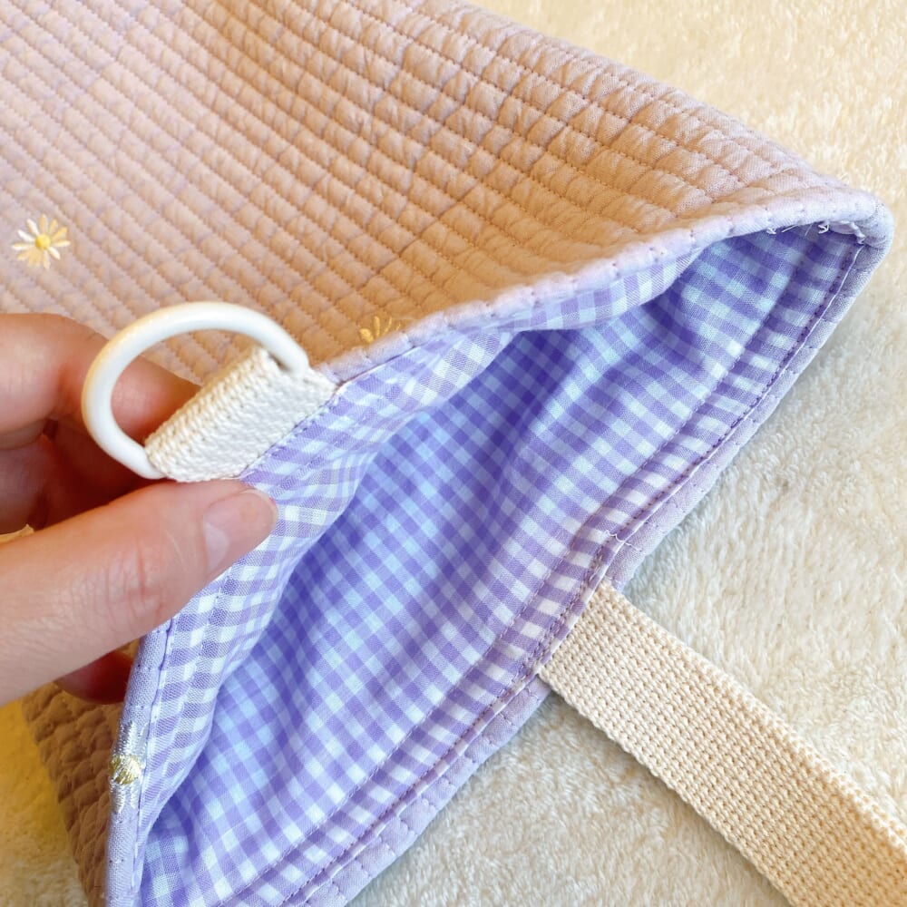 ギンガムチェックの裏地をつけました。裏なしでもよかったのですが、やっぱり裏があったほうが仕上がりもきれいで丈夫にできる気がします。
