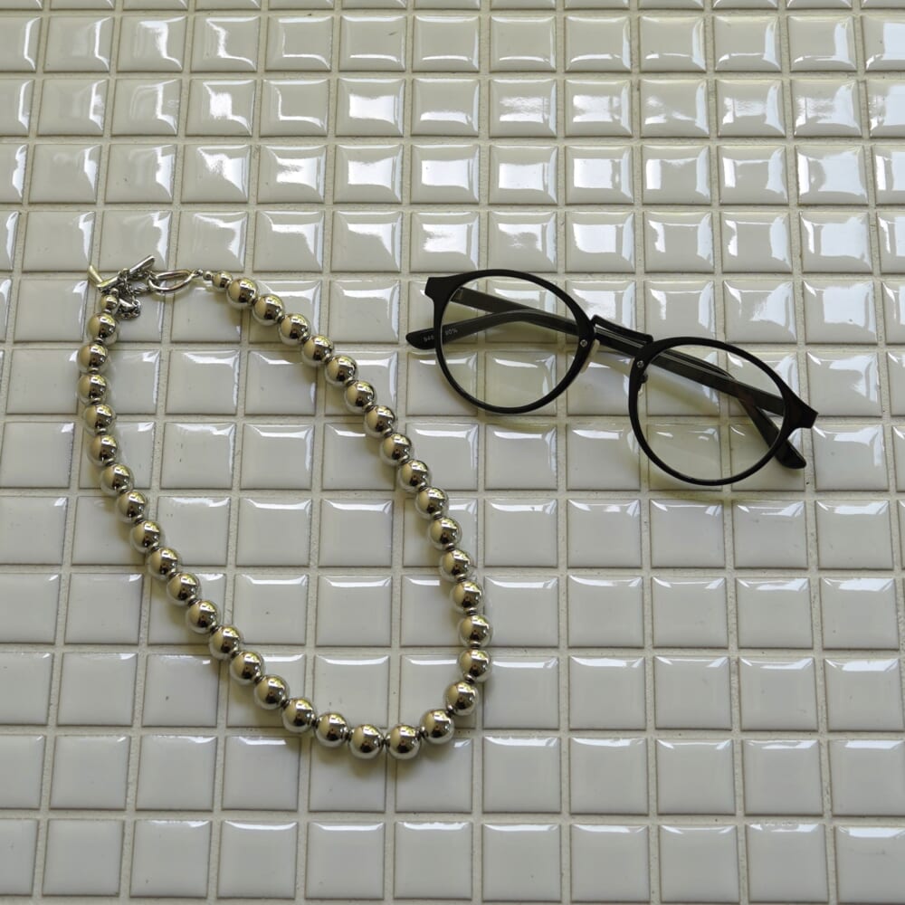 そこでアクセサリーとメガネを足してこなれ感を出す工夫を。
