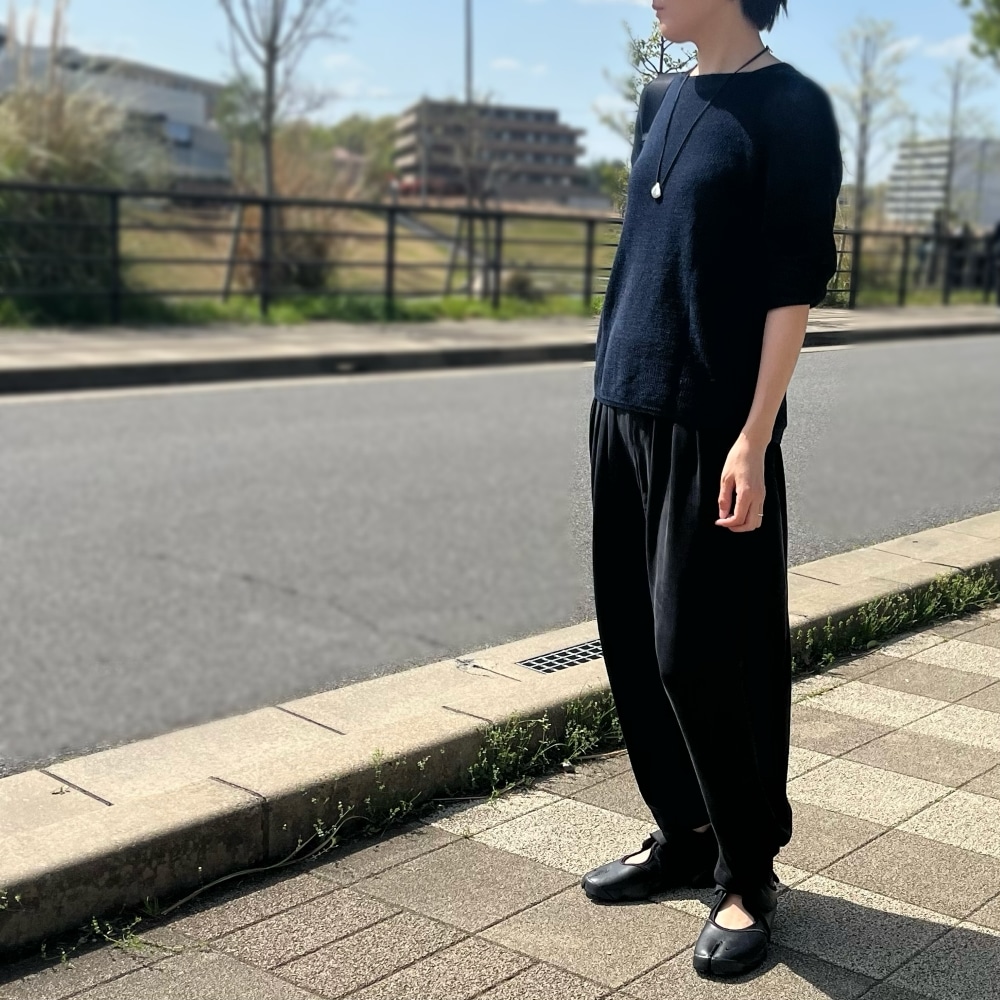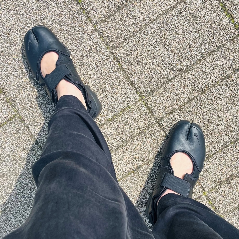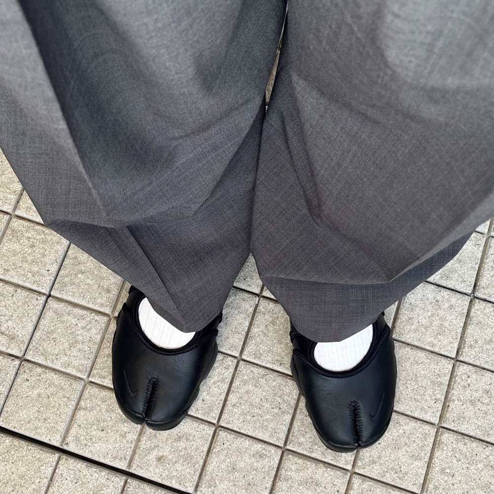 フルレングスのスラックスにあわせると、カジュアル感のあるベルトの部分は上手く隠れて、つま先の足袋のデザインがちょうどよいバランスで見えます◎