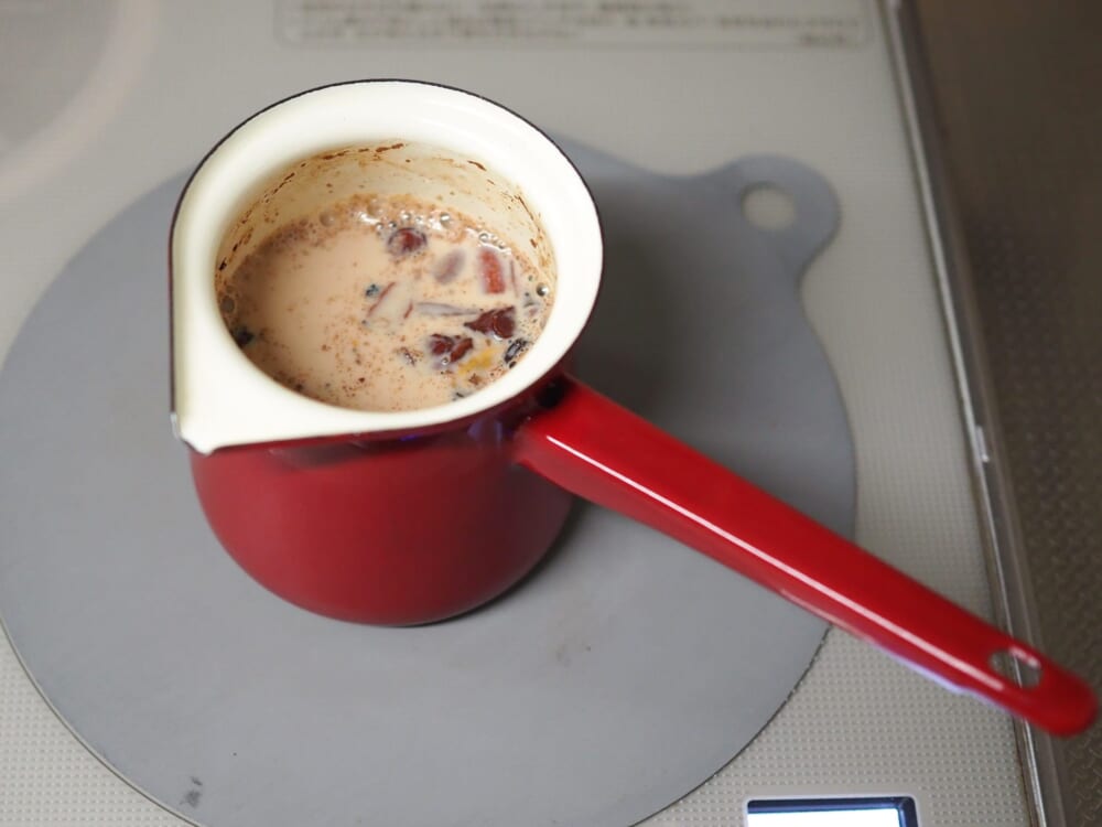 パッケージに書いてある淹れ方には、23gの茶葉に、320gのミルク(植物性がおすすめ)を入れてゆっくり加熱とあります。