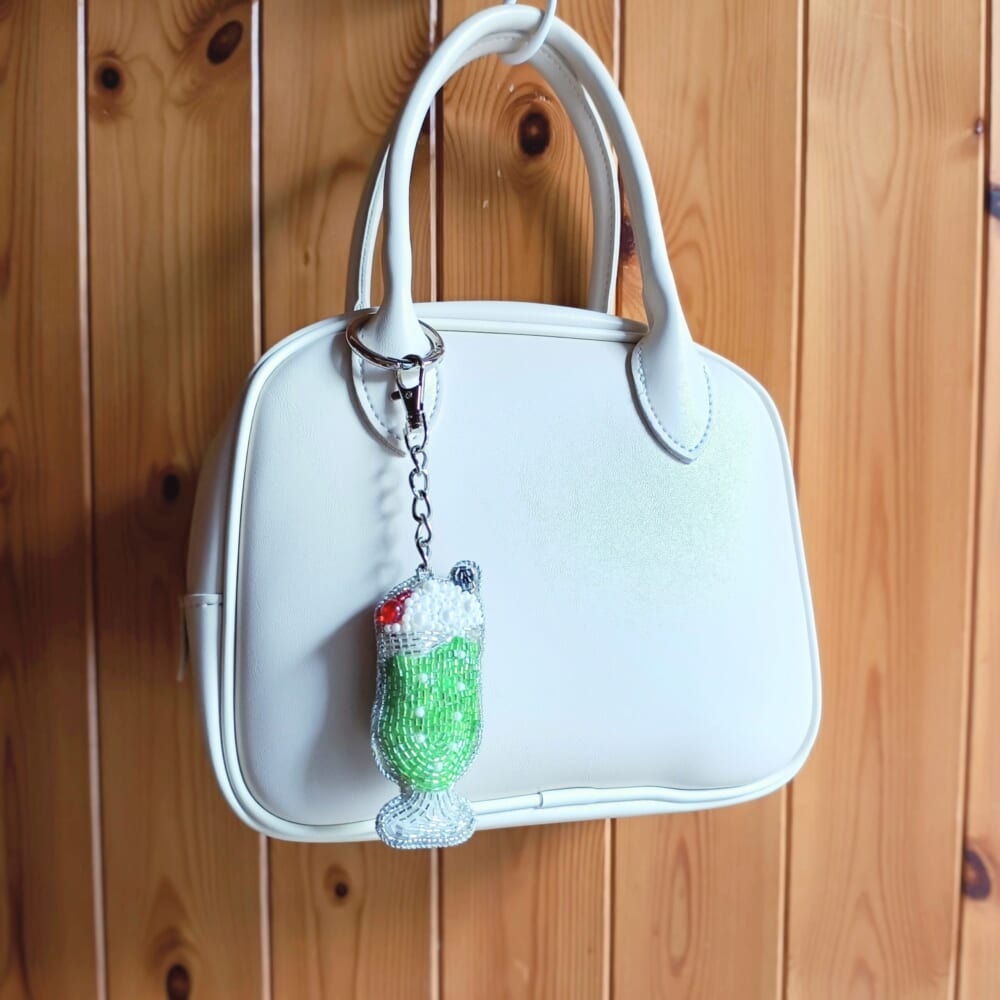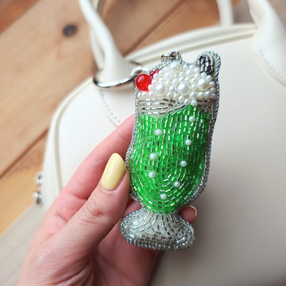 クリームソーダモチーフなので、一見するとポップなんですが、ビーズのきらめきが上品なイメージも。