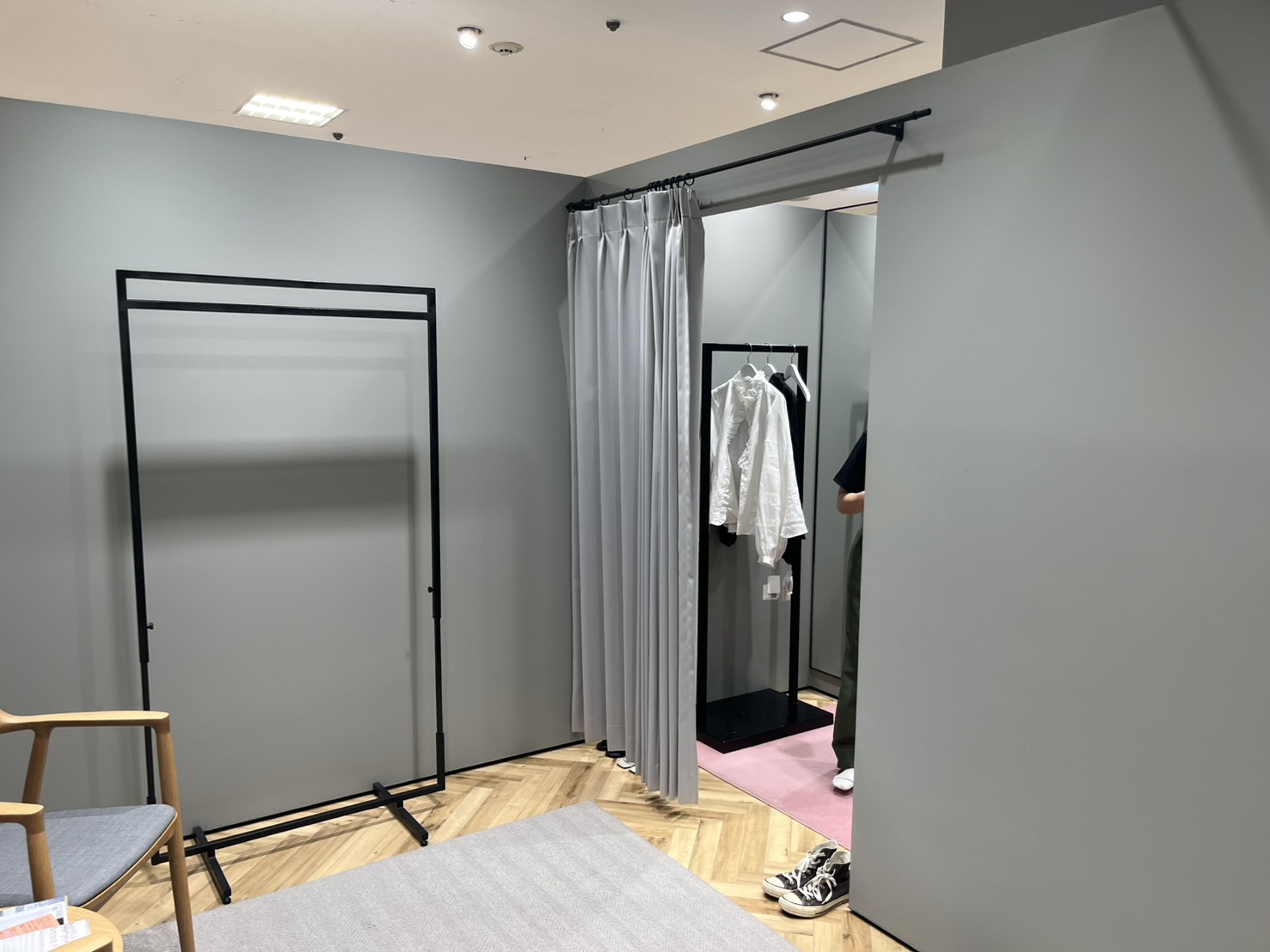 ブース型だと荷物の置き場に困ったり、焦ってしまったり、引きで鏡を見るのが難しいと感じたりしますが、これならゆったりと試着をすることができます。