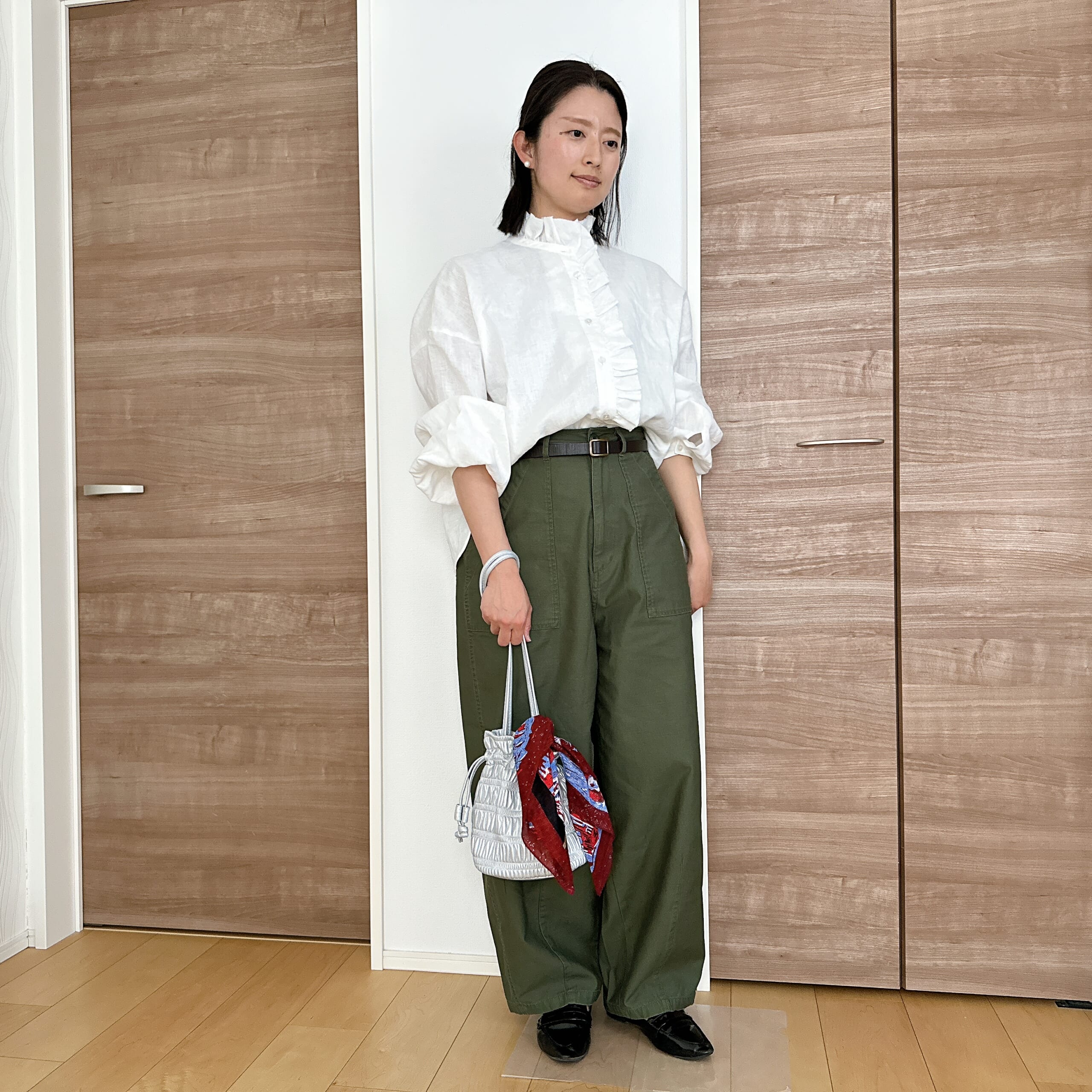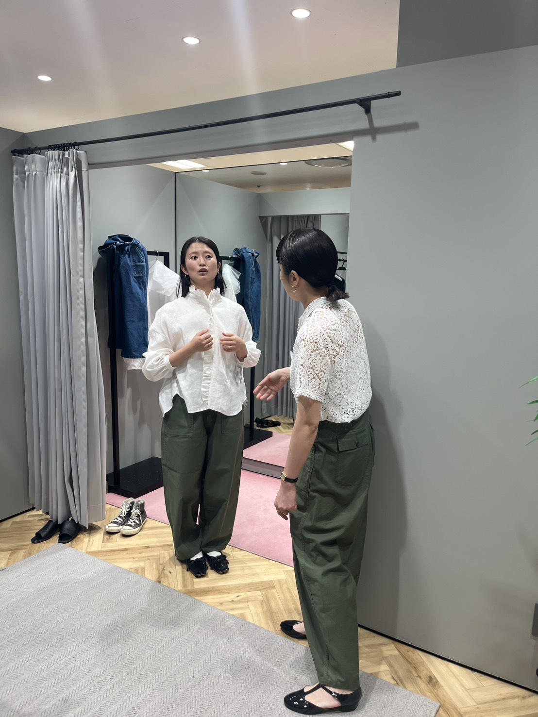 というわけで、コーディネート講座終了後も、本気の買い物にフジコちゃんが付き合ってくれて(フジコちゃんありがと♡)、はじめに試着したリネンフリルブラウス/ホワイトと、カーヴィパンツ/カーキ を購入♪