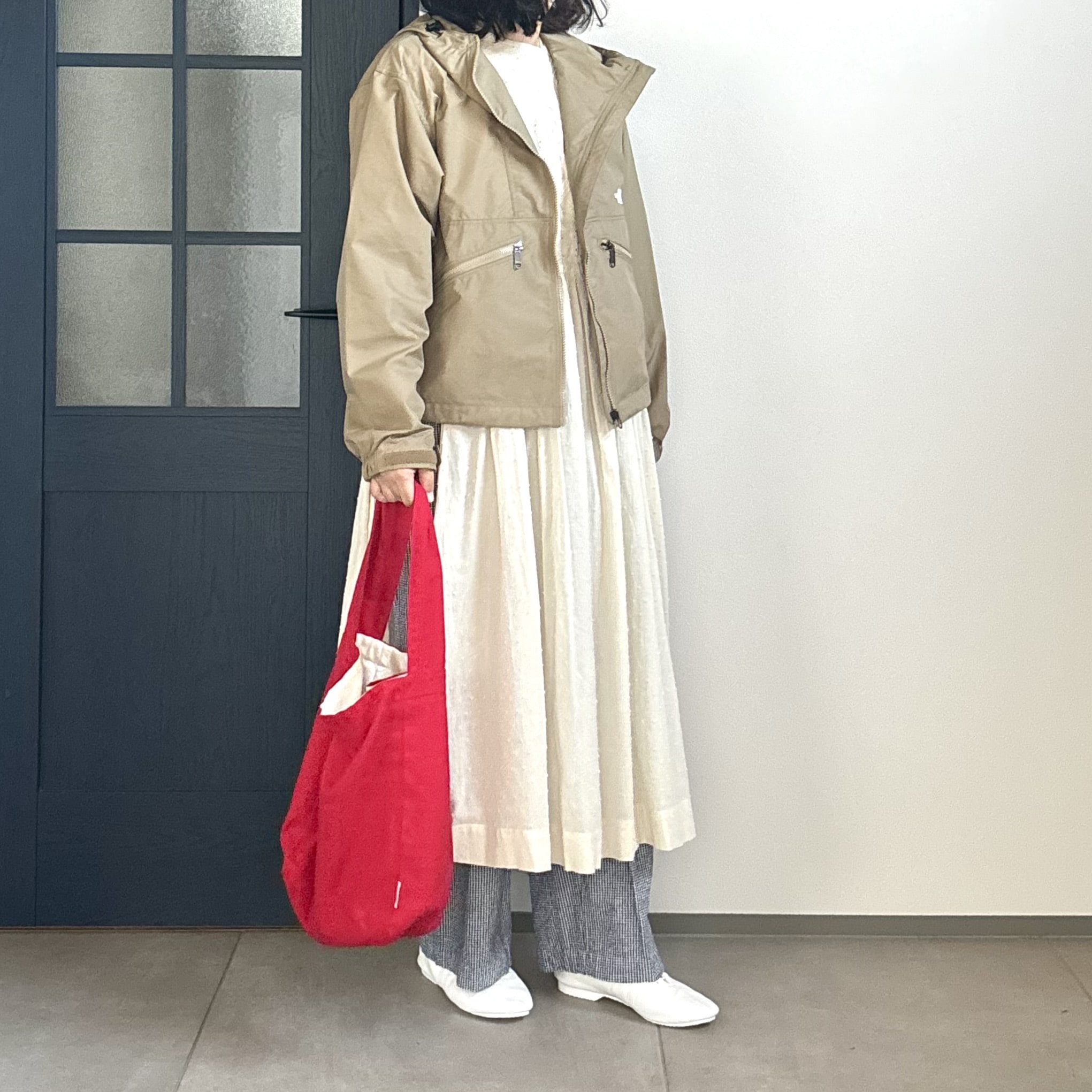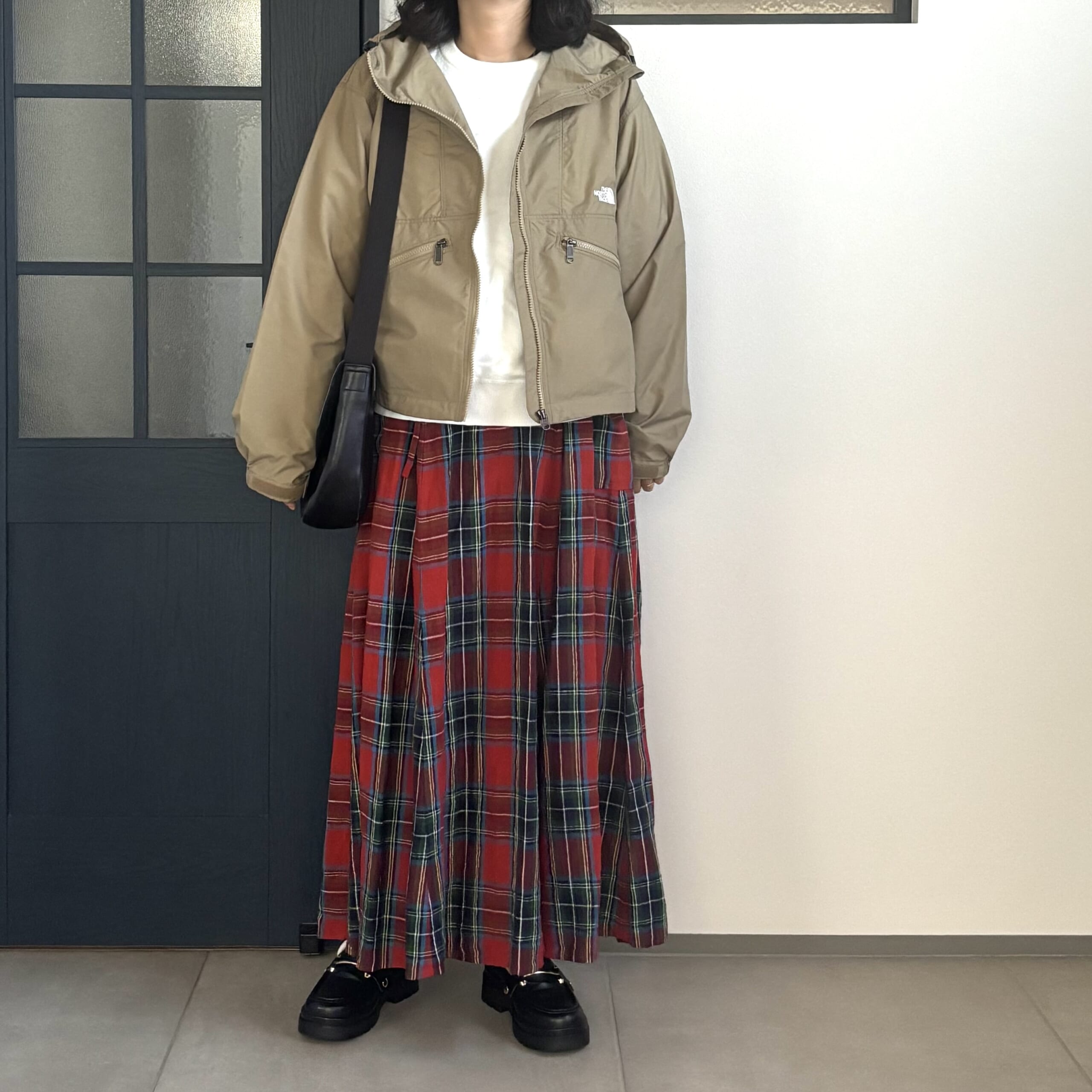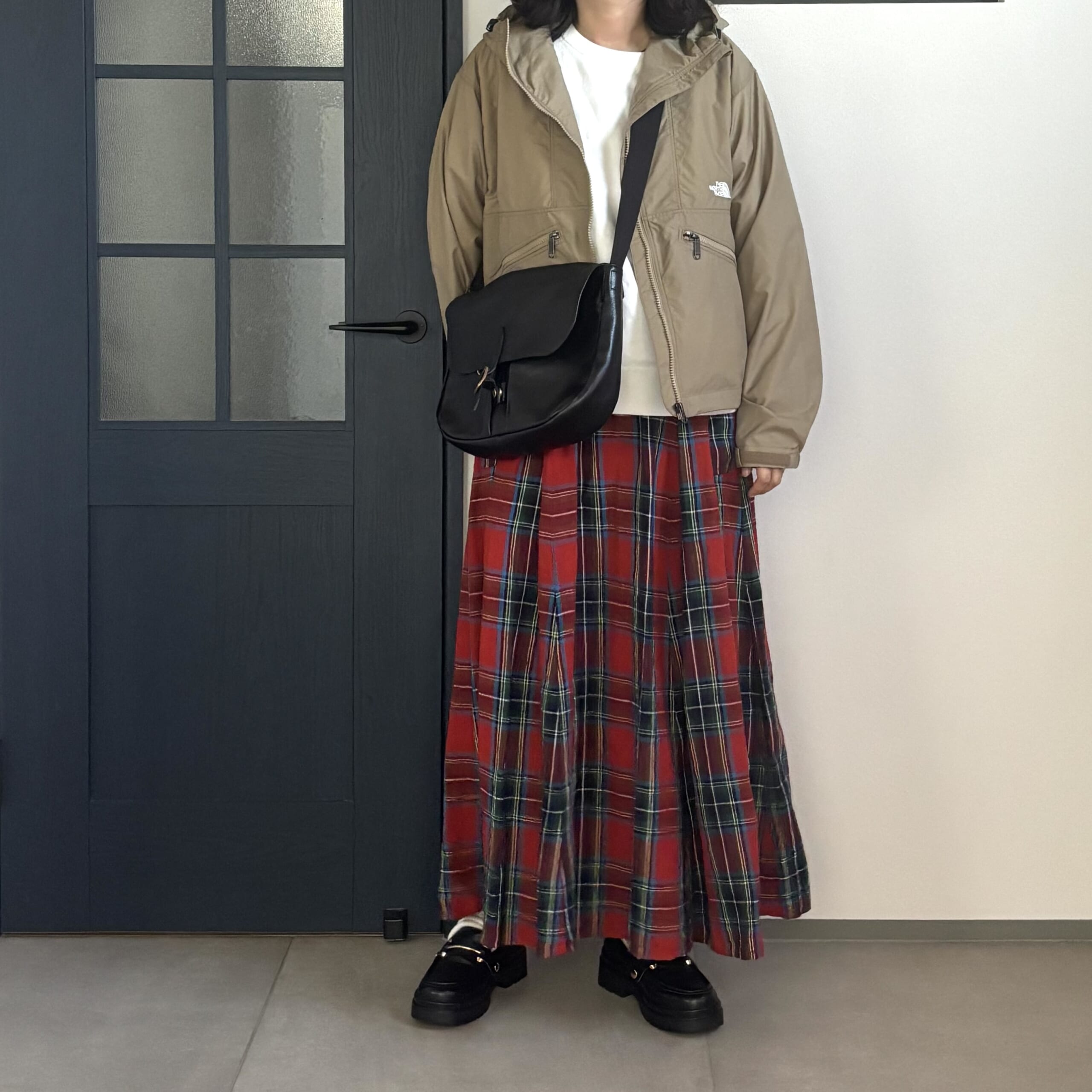 先ほどの赤チェックのワンピースコーデもですが、カーキ×赤チェック って相性抜群ですよねー。