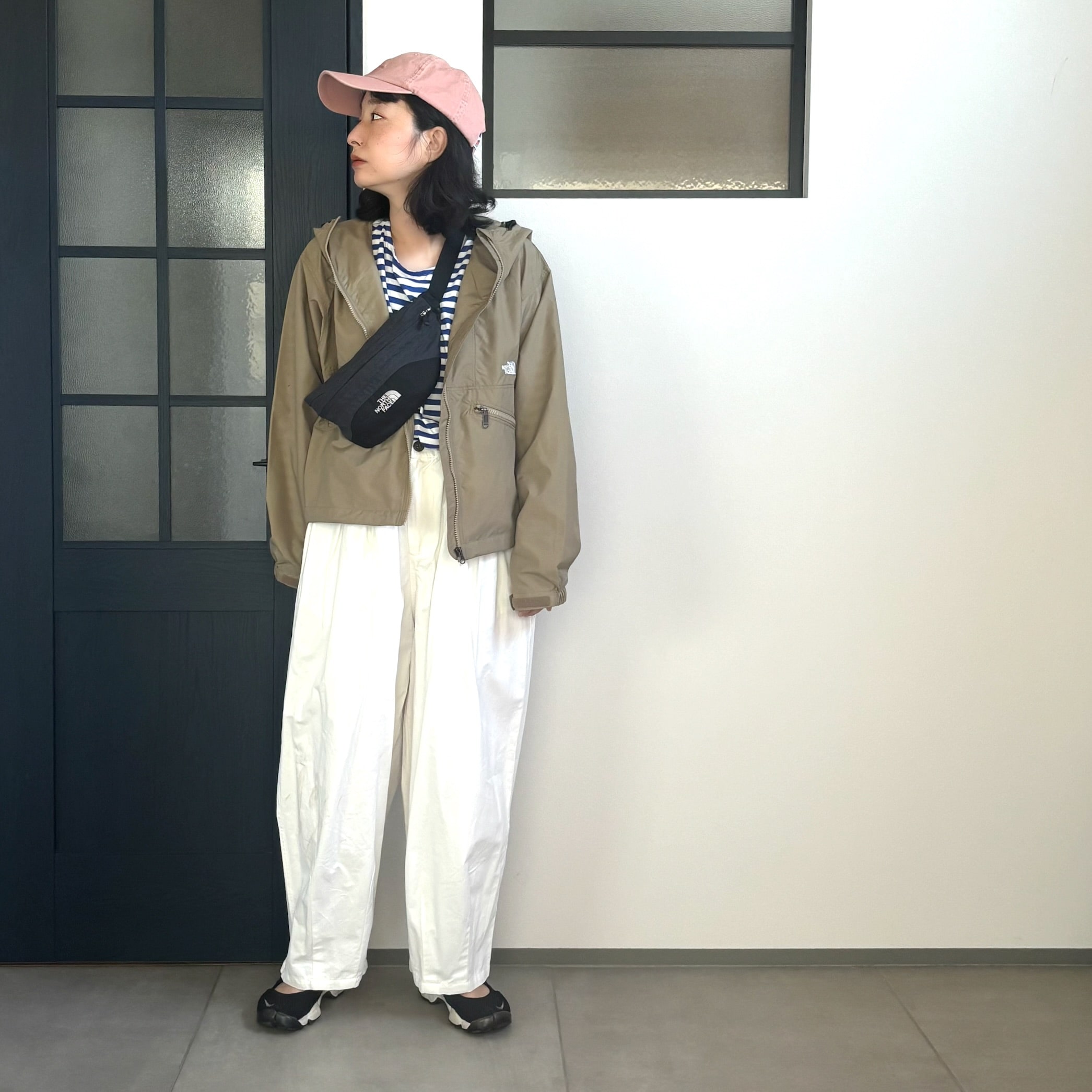 キャップ&ウエストバッグでアウトドア感をプラスして、春らしい軽やかな組み合わせに。