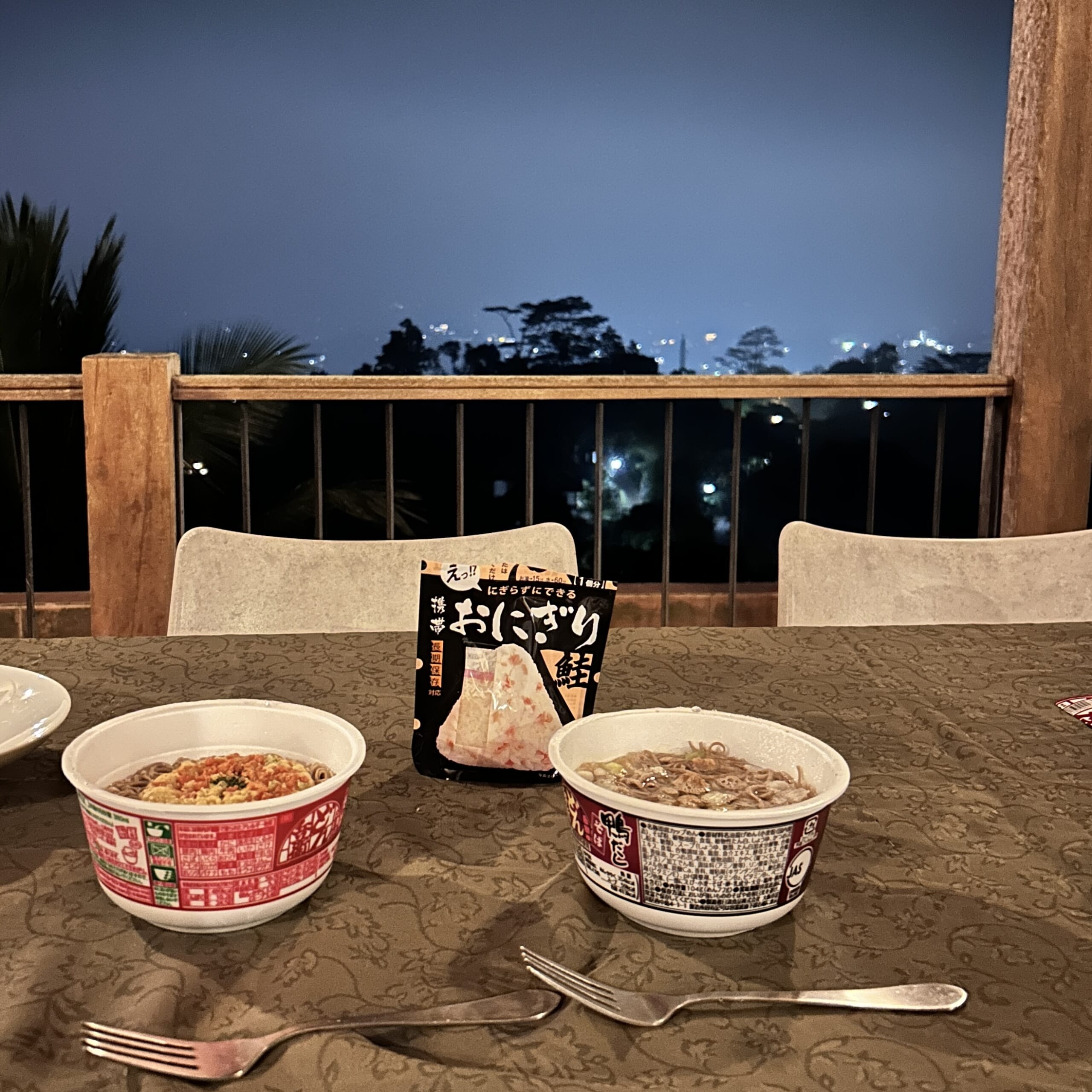 宿のテラスで食べたどん兵衛。きっと記憶に残るんだろうな〜と思いながら。