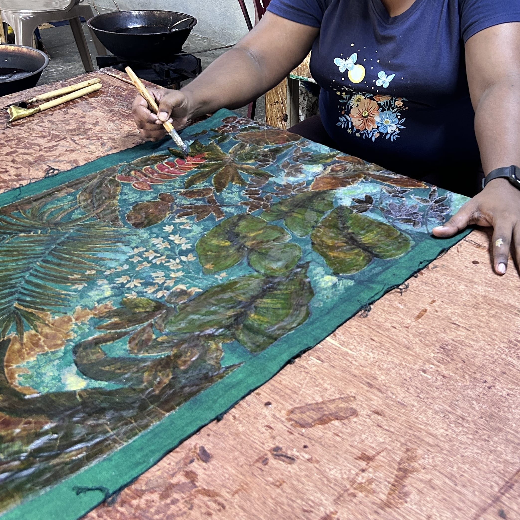 バティックは、スリランカの工芸品で、溶かした蝋で布に絵を書き、布を染色して染め分ける、ろうけつ染めです。
