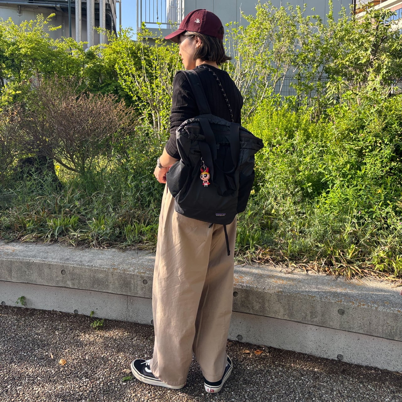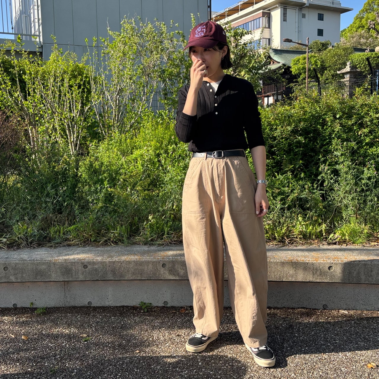 ボルドーのキャップを差し色に