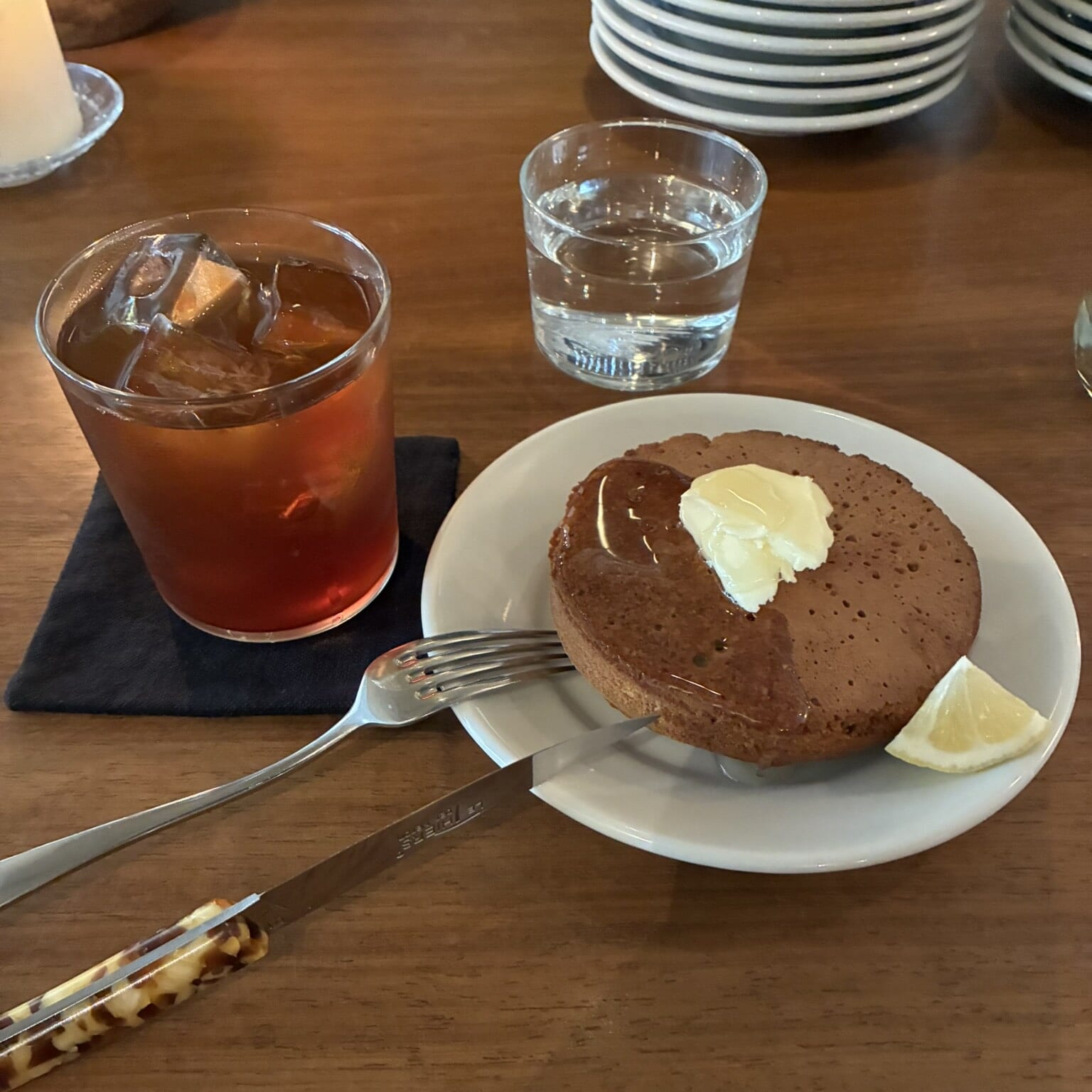 どれも美味しそうなメニューに目移りしながら、せっかくだからと人気メニューの「ホットケーキ」を注文。全粒粉で作られたホットケーキはナイフを入れるとザクっという音が聞こえるくらいサクサク。