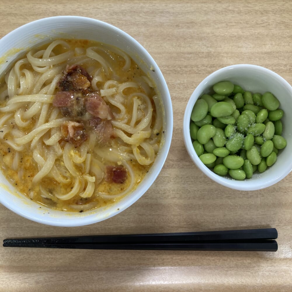 新しいメニューはカルボナーラうどんと枝豆