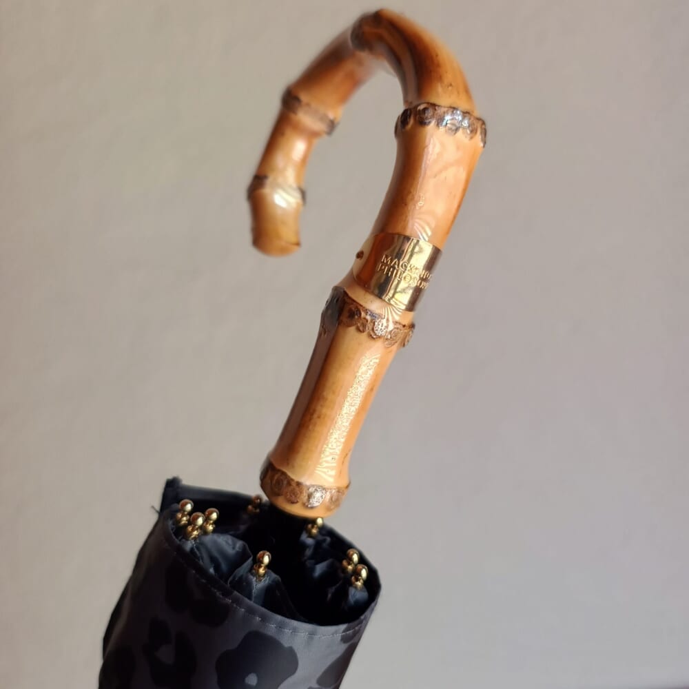 きらりと光るシャンパンゴールドの石突とバンブーの持ち手が上品です。