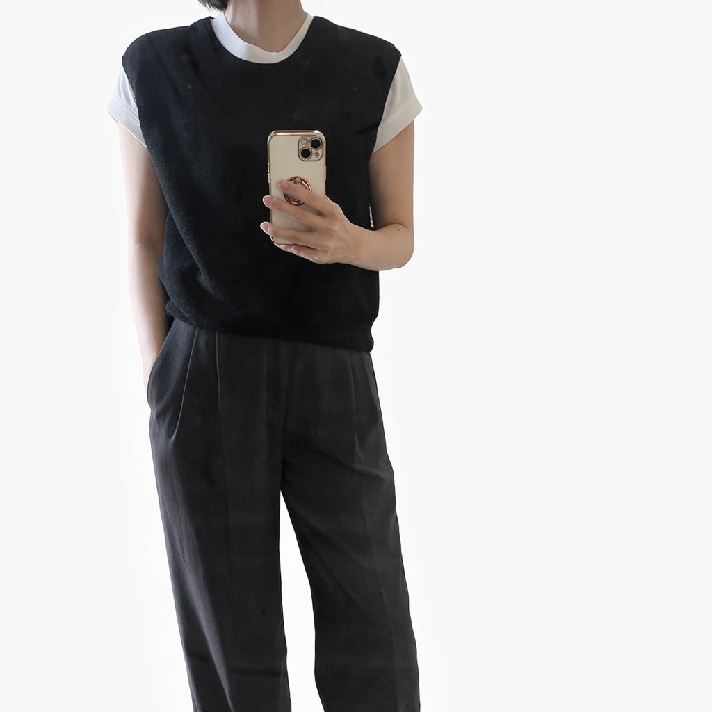 ノースリーブセーターと半袖合わせて過ごしています。