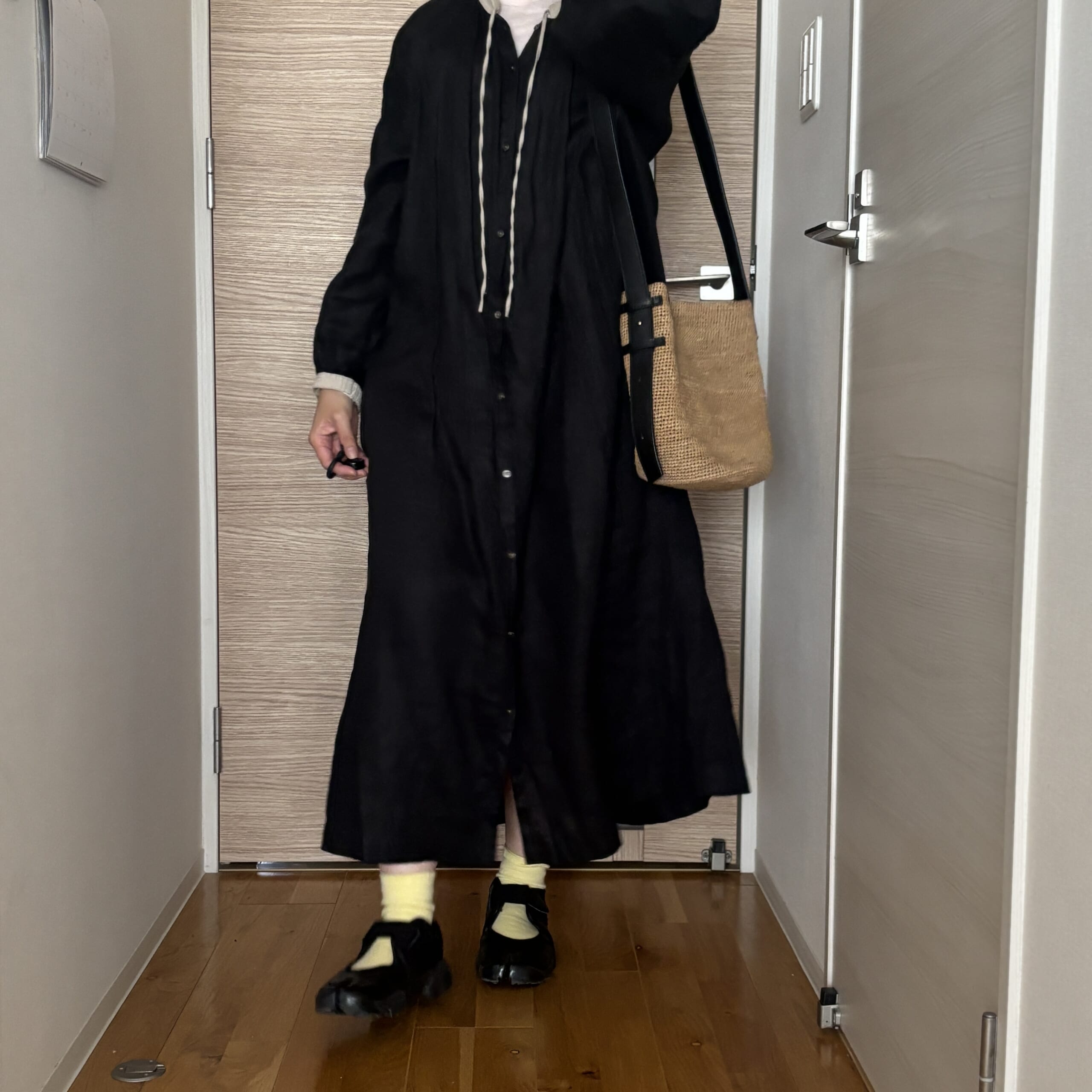 リネンのワンピースの時は、カナリアイエロー色のソックスをポイントにしました。
