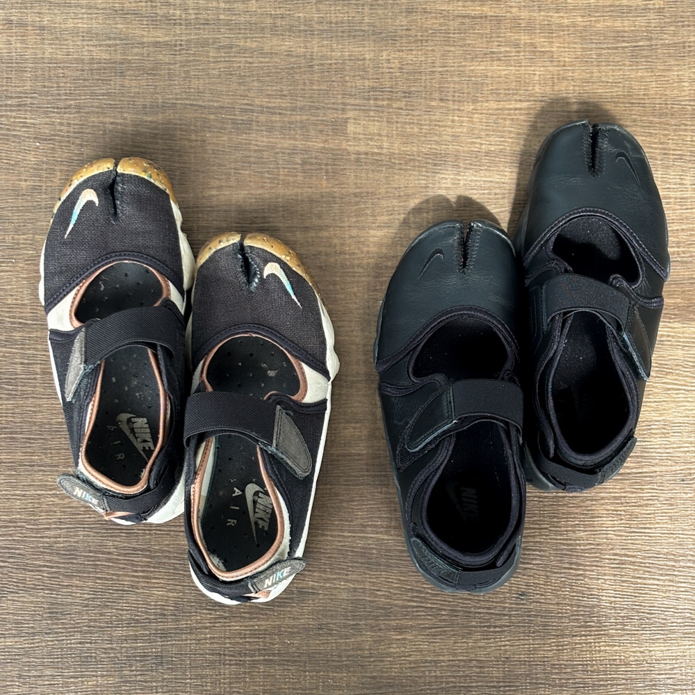 左側の初代エアリフトを購入したのは6年前。春、夏、秋と真冬以外はフル稼働させて、通勤にも履いていくし、キャンプにも履いていっていたら、さすがにクタクタになってしまいました。
