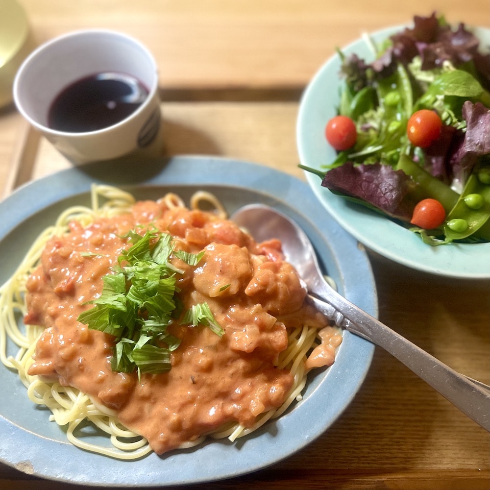 - 海老のトマトクリームパスタ