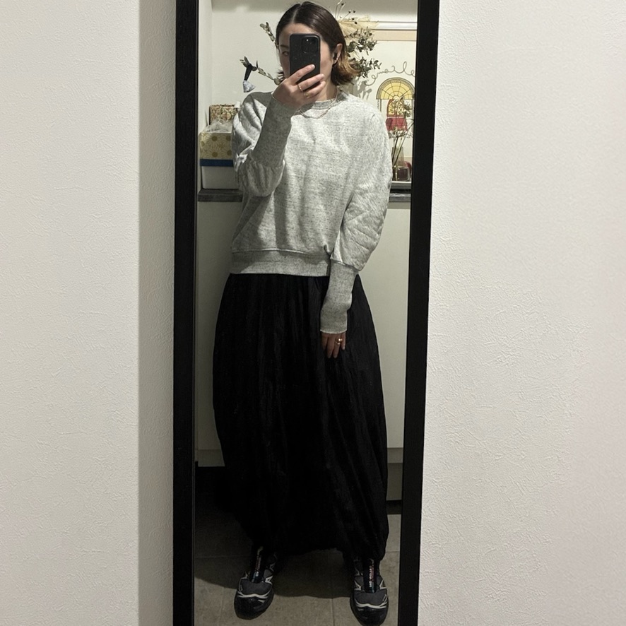 仕事で帰宅が夜になる日は、スウェットが活躍。ボリュームのある袖が特徴的なスウェットはいつもパンツを合わせていましたが、今年はなんだかスカートな気分。この春購入したシルエットが変えられるバルーンスカートでアップデートを図りました。