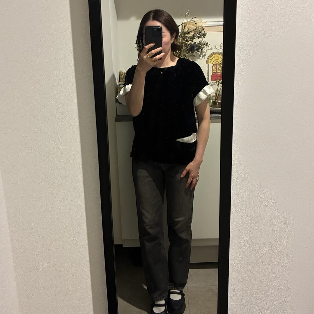 ベルベット素材が大好きなのですが、冬素材なのに半袖なので着られる期間がかなり短い!けれど、ずっとお気に入りで春と秋の短期決戦で楽しんでいます。一番落ち着くモノトーンでコーディネート。
