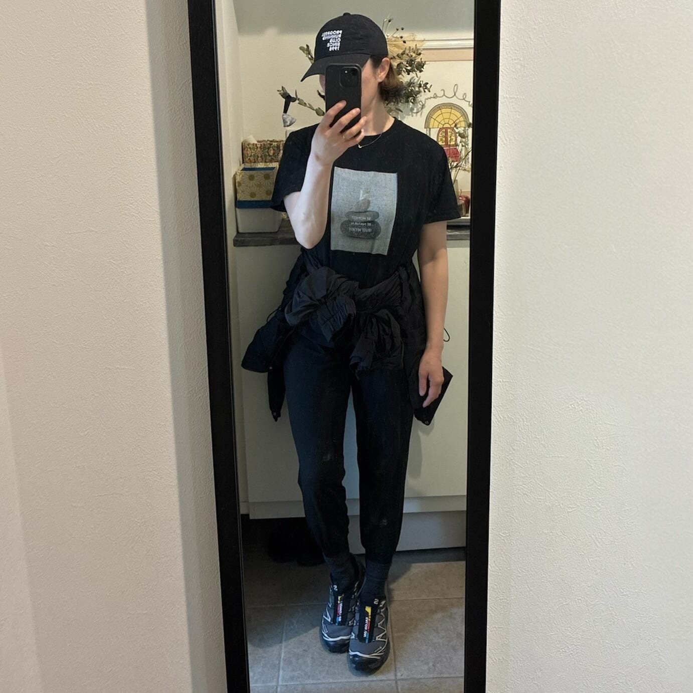 トップス/SERENE(ヨガウェアブランド)、ボトムス/Chacott BALANCE、キャップ/PROGRESS RUNNING CLUB、スニーカー/SALOMON