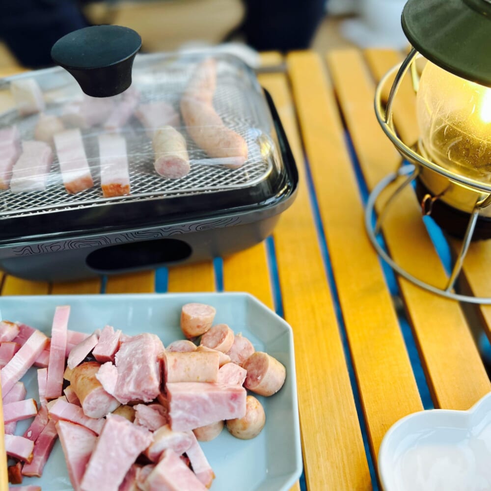 ベーコン・ソーセージ・ハムを次々と載せて、蓋をして5~10分ほど待つだけ。