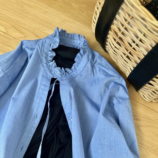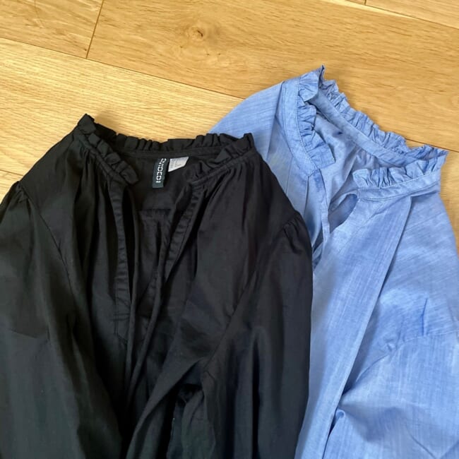 この2枚は、H&Mとcoenで見つけたのですが、コスパながらさりげないフリルとさらっとした素材感が気に入っていて、リボンはありますが、どちらも結ばずに着ています。