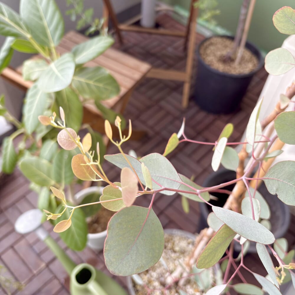 膝丈くらいの高さだったユーカリ・ポポラスも、申し分のない背丈まで育ってくれて、こんなに可愛い新芽を出してくれているのですが、剪定が下手なため特性を全く生かしきれず。