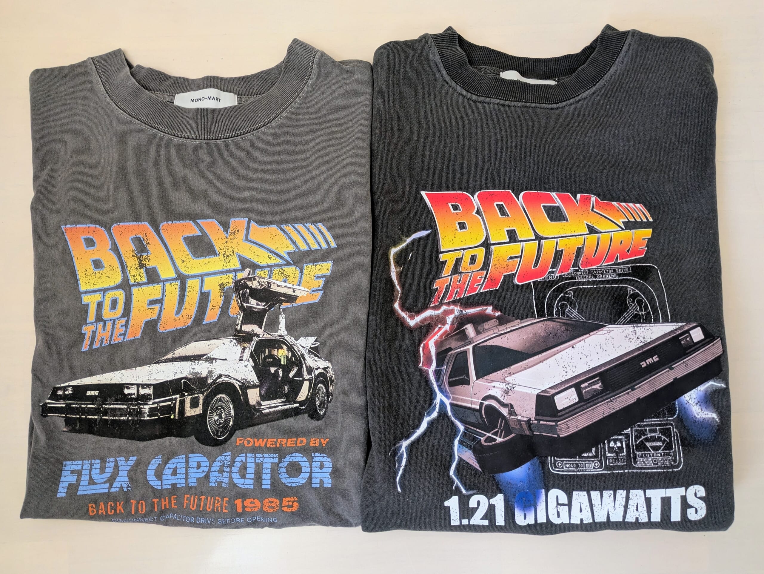 左側は夫所有のデロリアン柄、半袖Tシャツ(MONO MART)です
