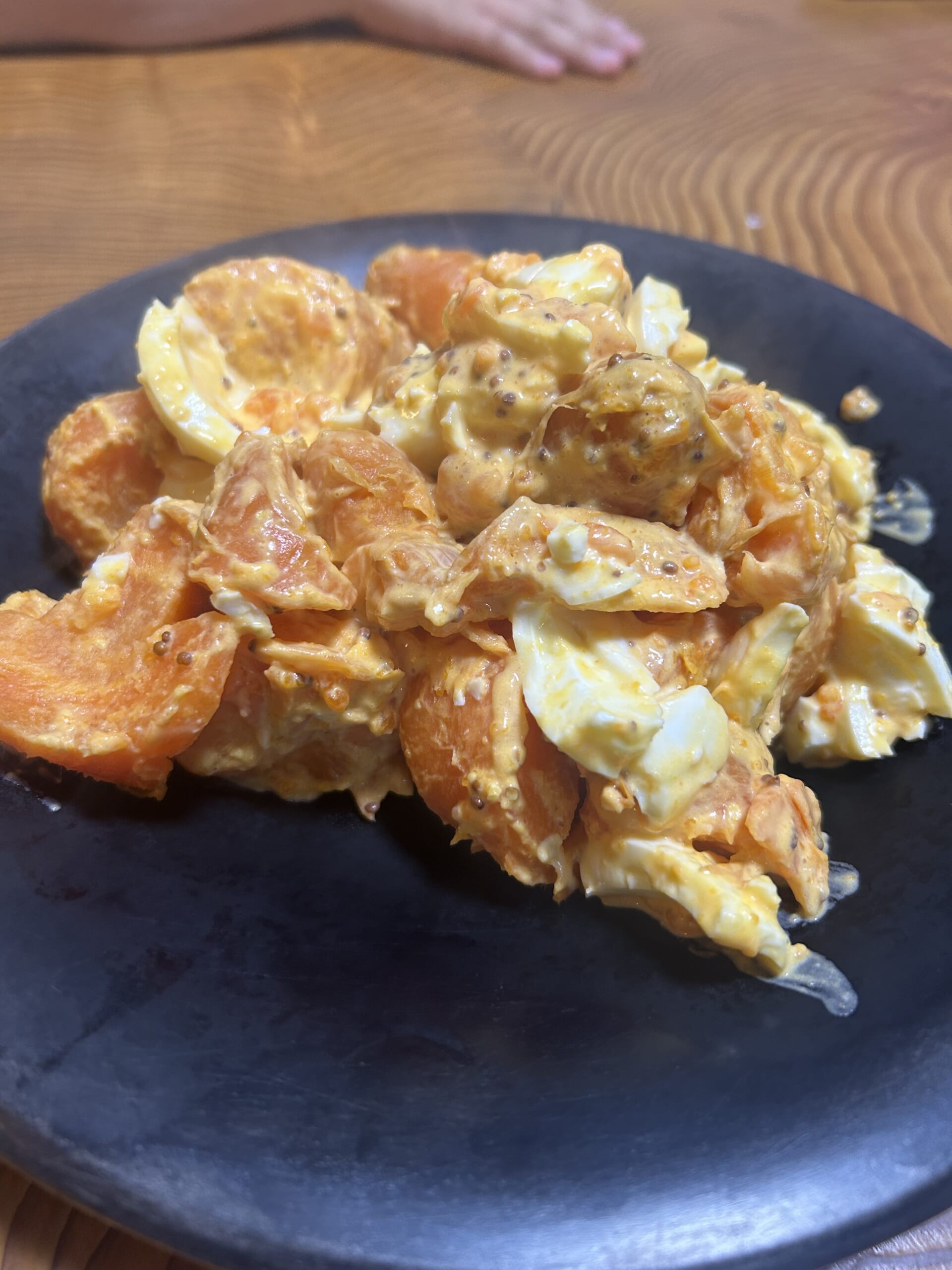 柔らかくなった人参とマヨネーズ、ゆで卵を和えて、人参サラダに。