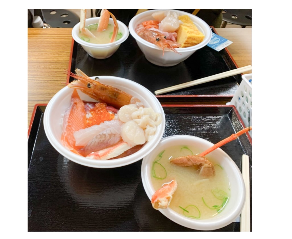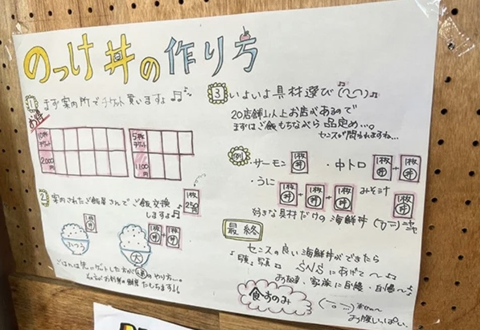 ご飯と引き換える食事券を購入し、市場内を回りながら好きなネタを券と交換して、自分オリジナルの海鮮丼などを作れます。刺身だけでなく、総菜や肉類をのせることもできるのが特徴です。初めてのこの体験にワクワクしました。
