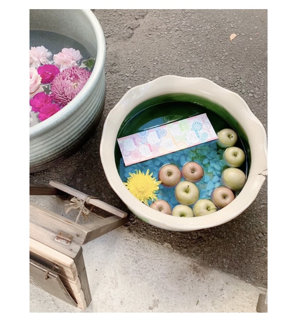お話をお伺いしたところ、もともとはあじさいの花手水をしていたところ、「もっと青森らしさを」という思いから、りんごを浮かべ始めたそうです。